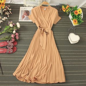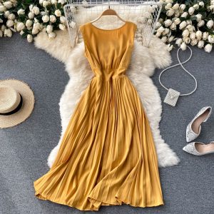 Summer Vintage Yellow/Green/Blue Pleated Dress Women Elegant Round Neck Sleeveless High Waist Draped Vestidos Female New