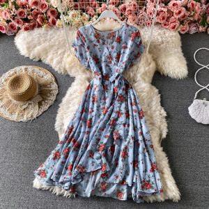 Summer Women Floral Printed Chiffon Dress Vintage Short Sleeve Irregular Ruffle Casual Vestidos Female Elegant Fashion Robe