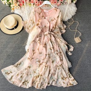 Summer Women Floral Printed Chiffon Dress Beach Party Vacation Vintage V-Neck Flare Short Sleeve Slim Ruffle Vestido Female