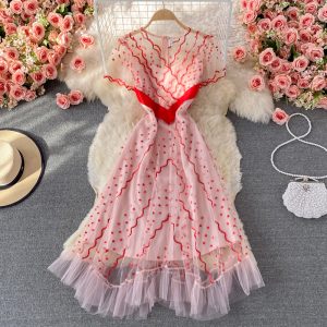 Summer Women Hollow Out Midi Dress Vintage Pink/White/Blue/Black O-Neck Short Sleeve High Waist Vestidos Female Party Robe