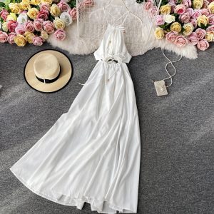 Summer White Hollow Out Spaghetti Strap Dress Women Sleeveless Drawstring Beach Party Long Dress New Fashion Vestidos