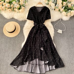 Black/White/Red Polka Dot Irregular Pleated Long Dress Women Vintage V-Neck Short Sleeve Ruffle Vestidos Spring Summer New