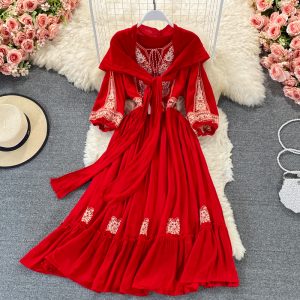 Bohemian White/Yellow/Red Embroidered Dress Women Scarf Collar Puff Long Sleeve Elegant High Waist Vestidos Female Robe New