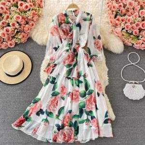 Bohemian Floral Long Dress For Women Spring Autumn Bow Collar Long Sleeve A-Line Printed Maxi Robe Female Elegant Vestidos
