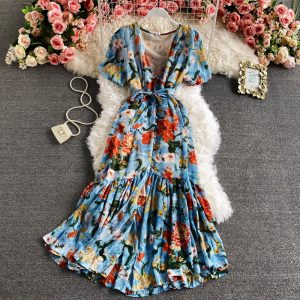 Bohemian Vacation Beach Floral Printed Long Dress Women Sexy V-Neck Short Sleeve High Waist Ruffle Hem Vestidos Spring Summer