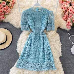Blue/Pink/White Hollow Out Dress Women Vintage Short Sleeve Round Neck A-Line Lace High Waist Mini Vestidos Female Summer