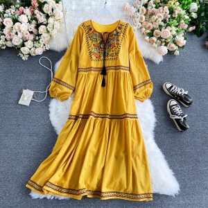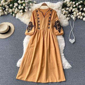 Bohemian Embroidered Dress Women Autumn Vintage V-Neck Long Sleeve Loose Vacation Party Vestidos Casual Female Robe Fashion