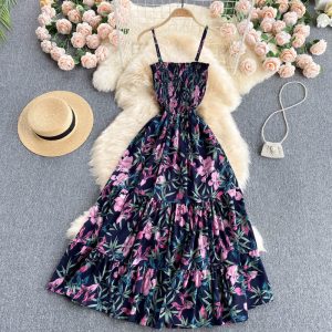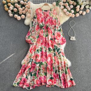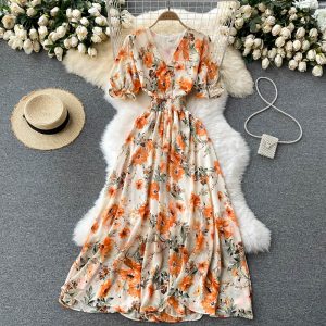 Bohemian Floral Chiffon Dress Women Summer Bohemian Flower Print Holiday Beach Midi Dresses Elegant Vestido New Robe Mujer