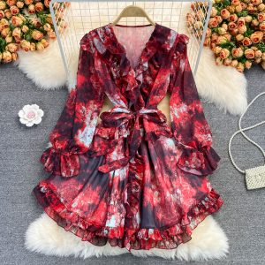 Bohemian Printed Chiffon Mini Dress For Women Autumn Sexy V-Neck Ruffle Flare Long Sleeve High Waist Vacation Beach Vestidos New