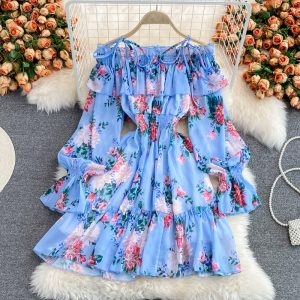 Bohemian Blue Floral Chiffon Mini Dress Summer Women Sexy Slash Neck Flare Long Sleeve Ruffle Vestidos Female Party Beach Robe