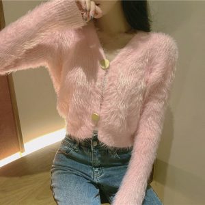 Autumn Winter Pink/White Sweater For Women Long Sleeve Single Breasted Sweet Cardigan Female V-Neck Short Knitted Tops New