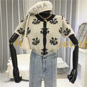 Women Floral Print Single Breasted Knitted Cardigans Elegant Short Sleeve O-neck Vintage Slim Knitting Tops Female Sweater