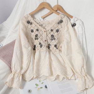 Sexy Hollow Out Blouse For Women Autumn Elegant V-neck Single-breasted Patchwork Shirt Female Flare Long Sleeve Beige/White Tops