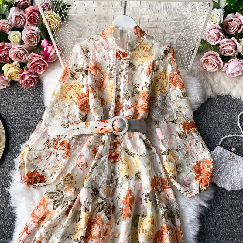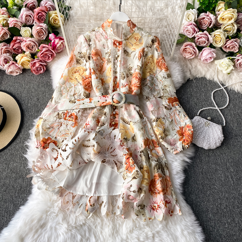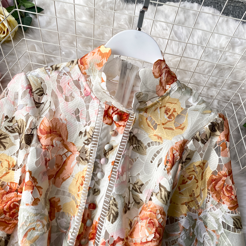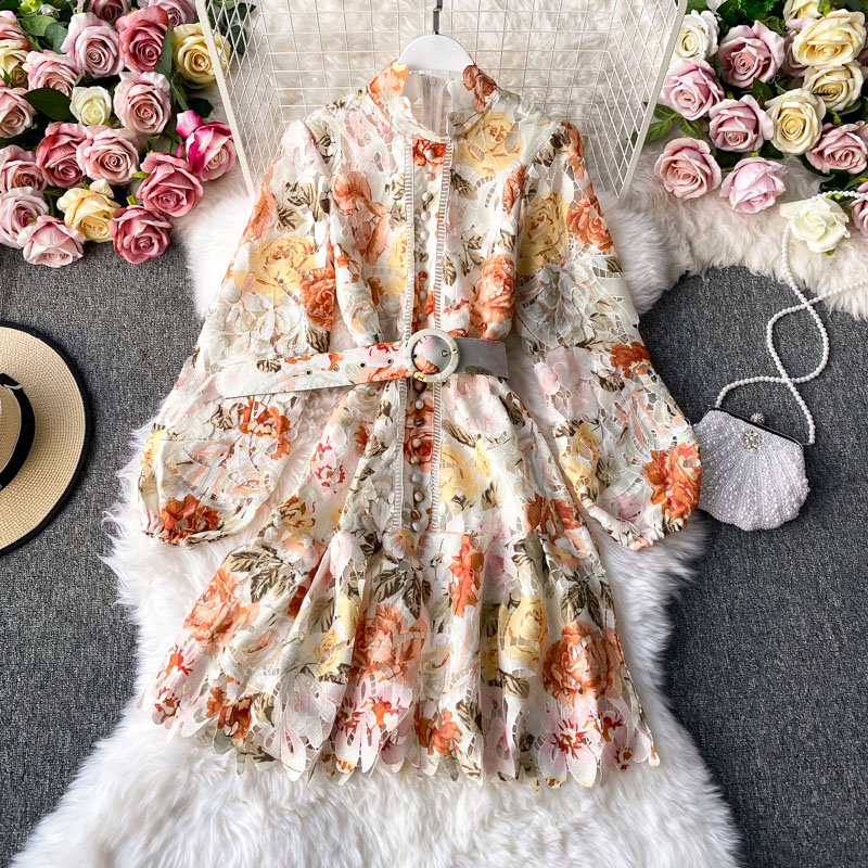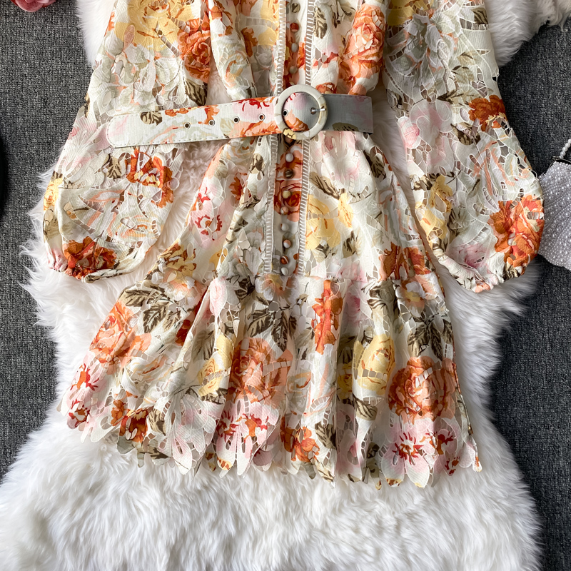 Bohemian Women Floral Mini Dress Autumn Elegant Puff Long Sleeve Hollow Out Boho Chic Dresses Female Vacation Beach Vestido