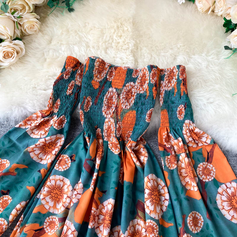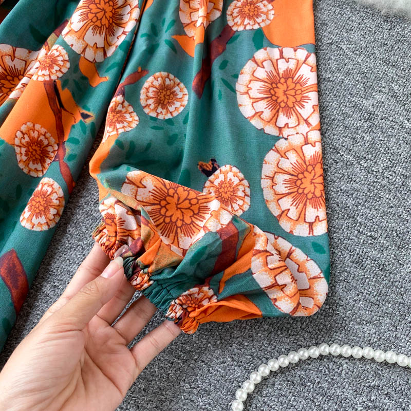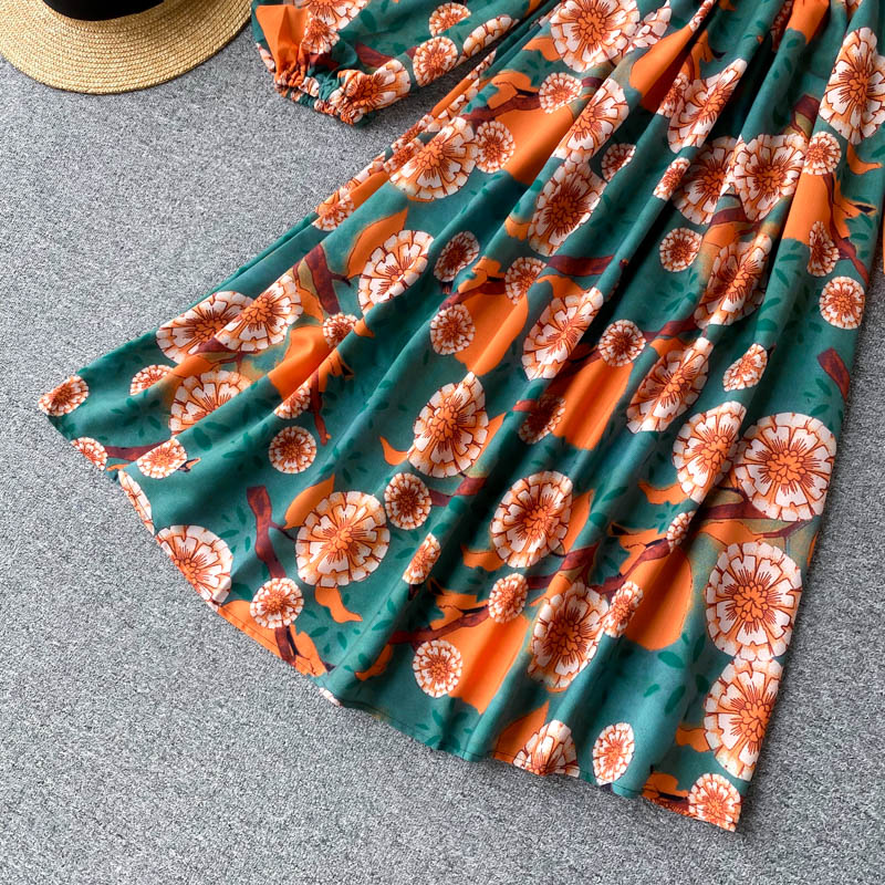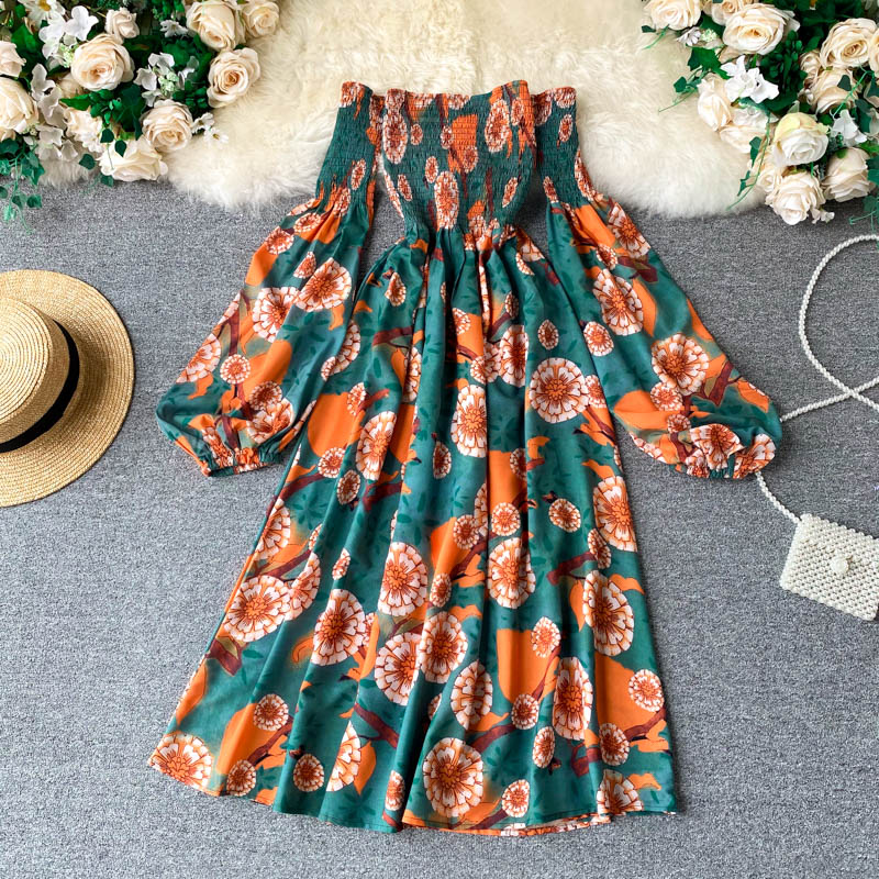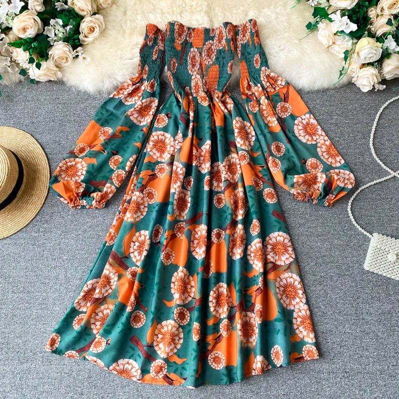 Sexy Slash Neck Women’s Floral Dress Autumn Puff Long Sleeve High Waist A-line Beach Dresses Female Casual New Fashion Robe