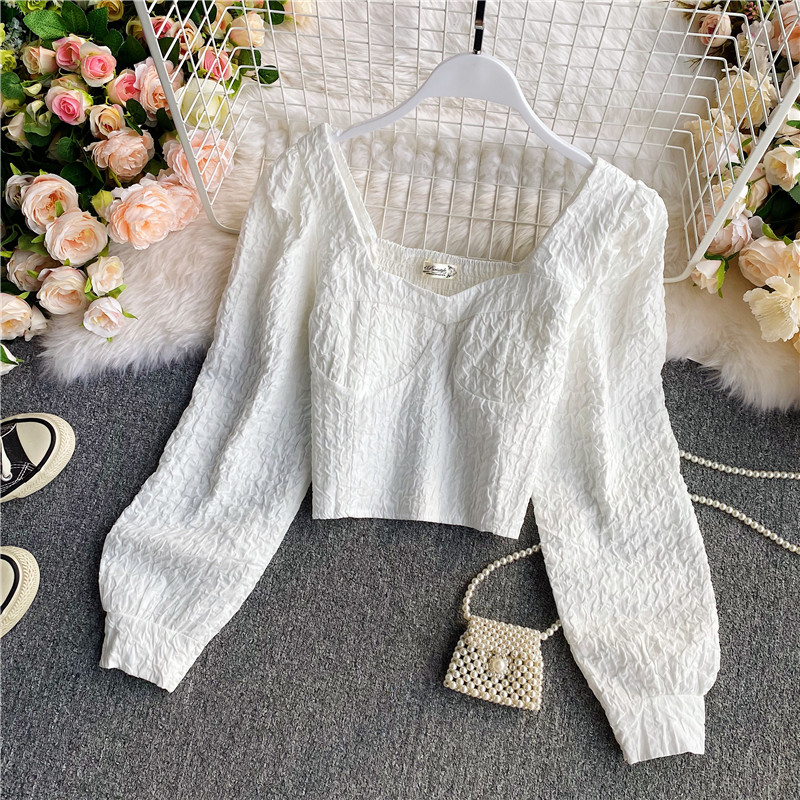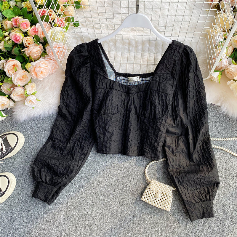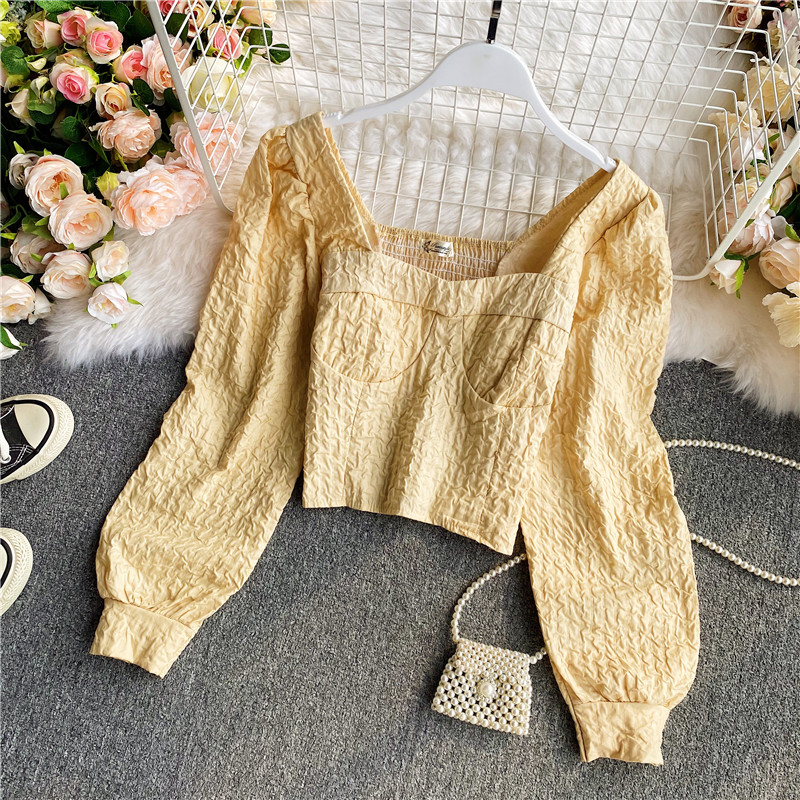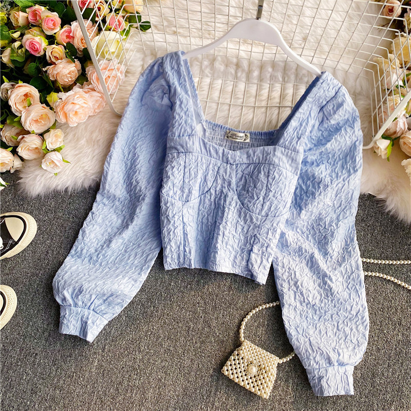 Cheap Blouses & Shirts, Buy Quality Women’s Clothing Directly from China Suppliers:Casual Blue/Yellow Blouse For Women Square Collar Puff Long Sleeve Short Tops Female Vintage Shirts Fashion Autumn New