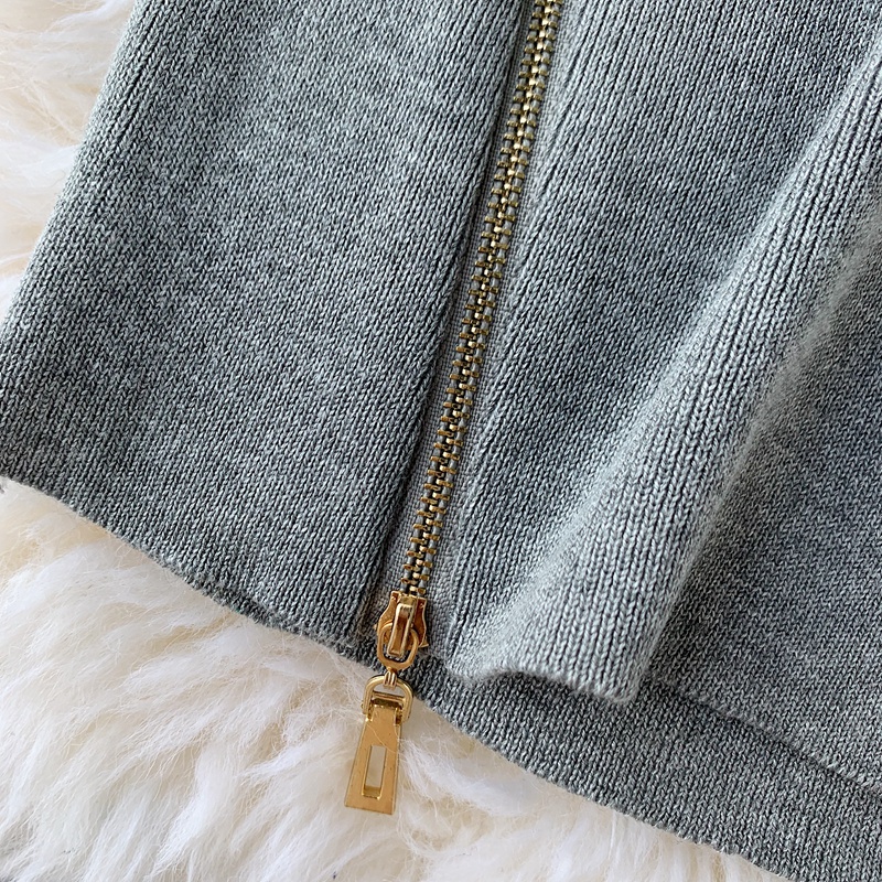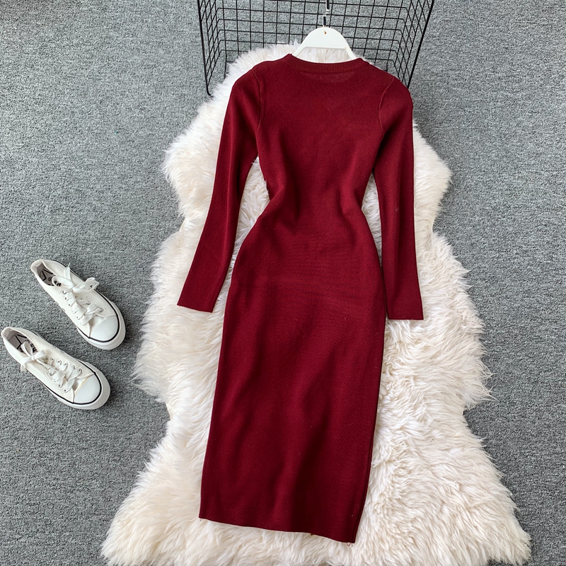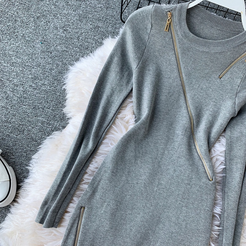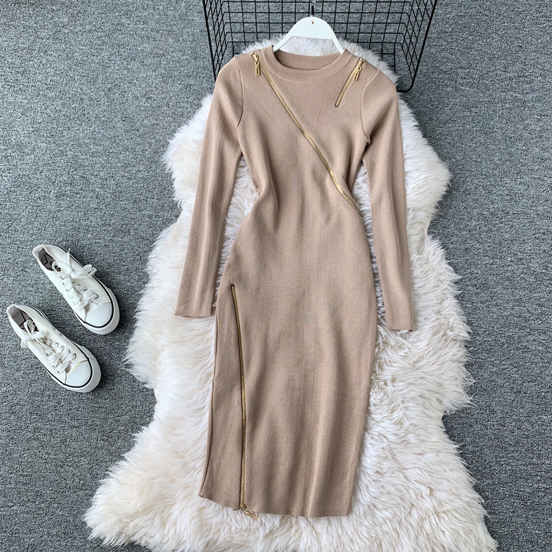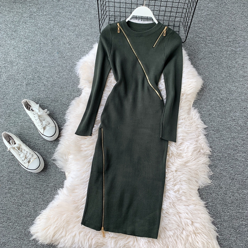Casual Round Neck Zipper Knitted Dress Female Long Sleeve Grey/Khaki/Green Bodycon Dresses Female Vestidos Fashion Autumn
