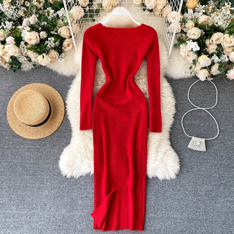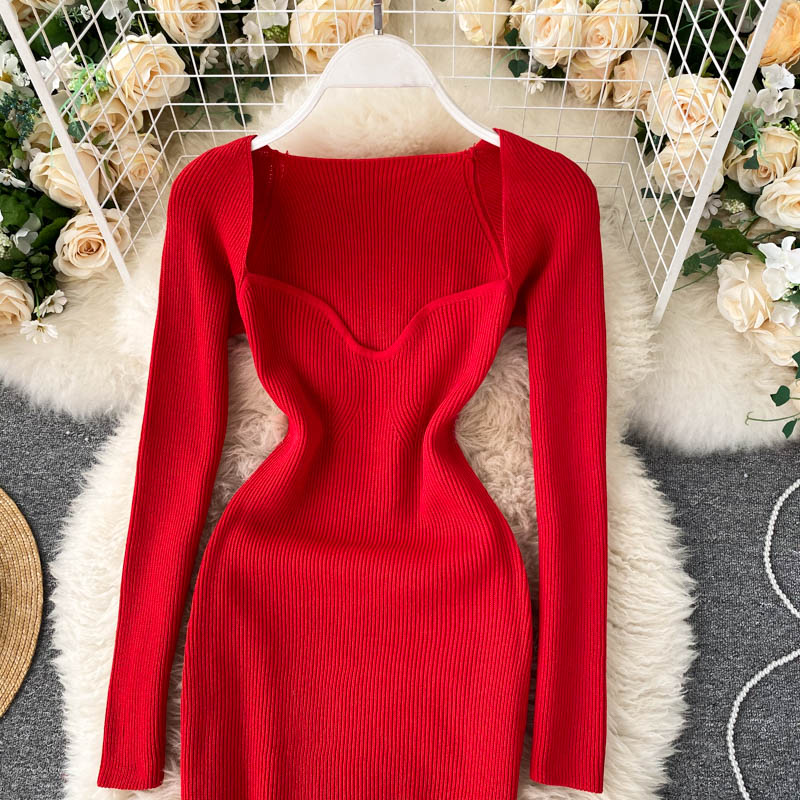 Sexy Low Collar Knitted Bodycon Dress Women Autumn Winter High Waist Long Sleeve Knit Dresses Female Vestidos New Fashion