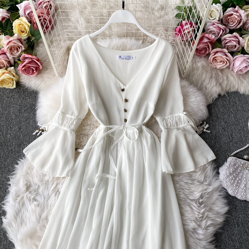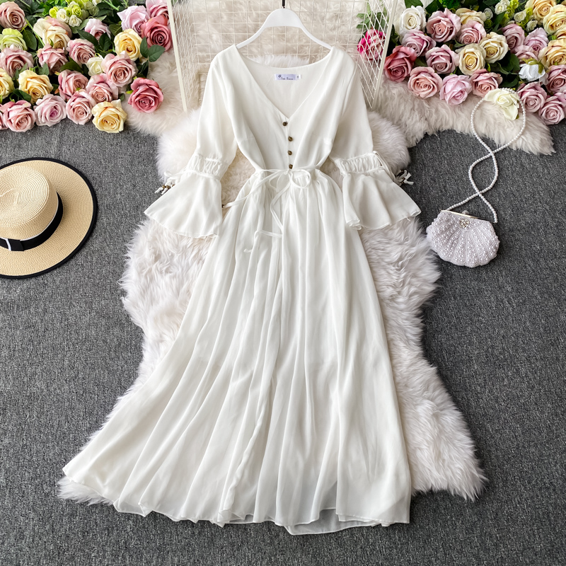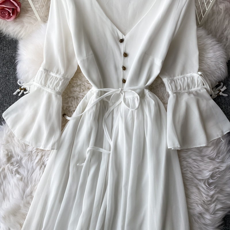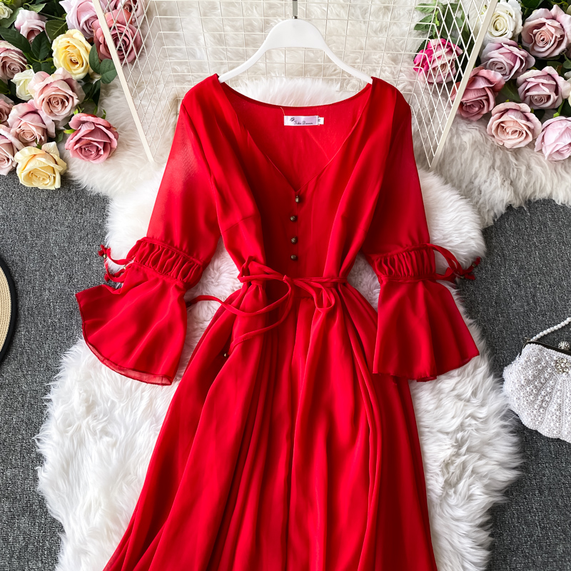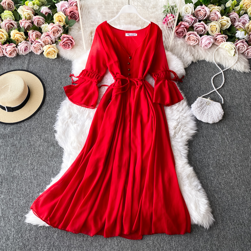 Sexy Red/White Chiffon Long Dress Vintage Flare Long Sleeve V-neck Single Breasted Women’s Dresses Female Autumn Vestidos
