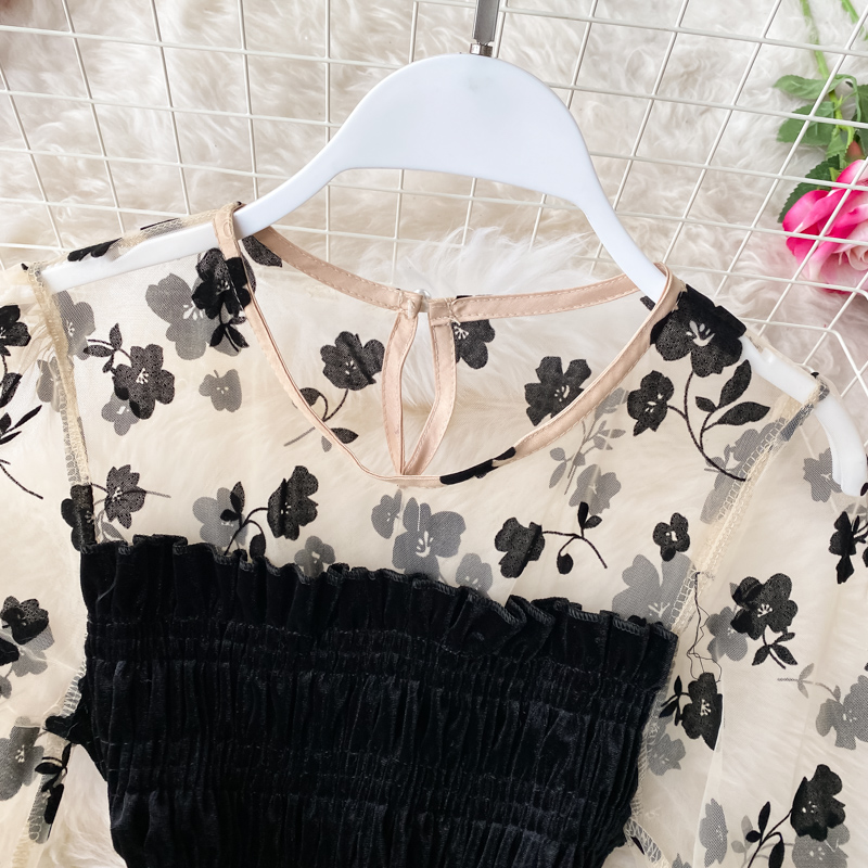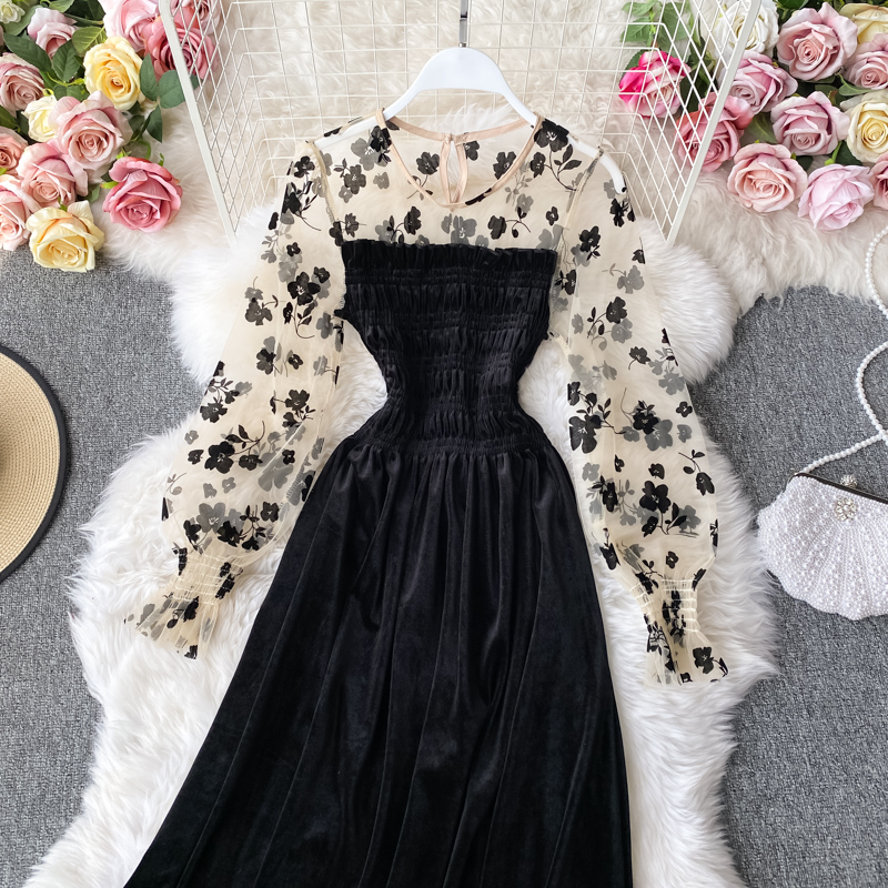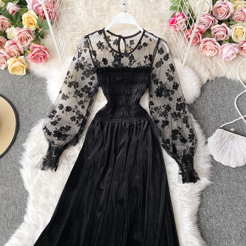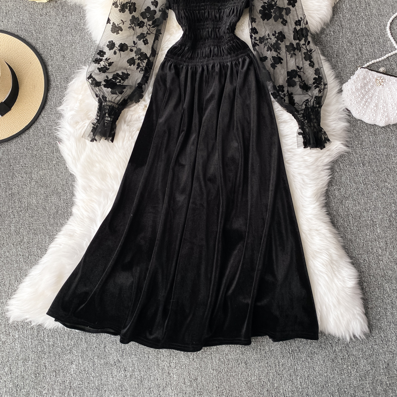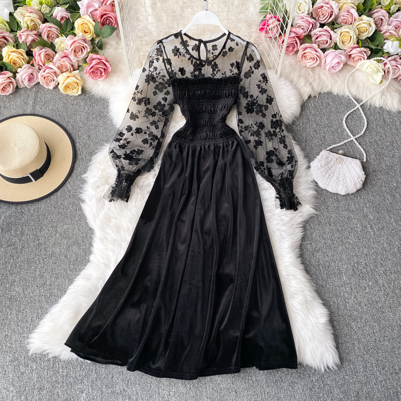 Sexy Mesh Patchwork Midi Dress Autumn Vintage Lantern Long Sleeve Big Swing Velvet Robe Party Vestidos New