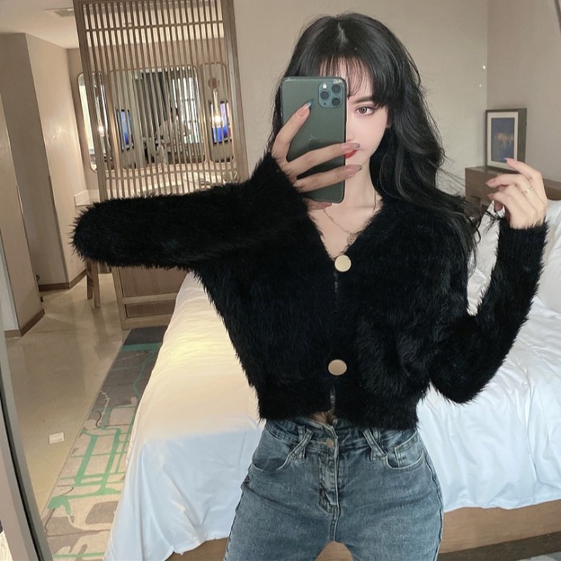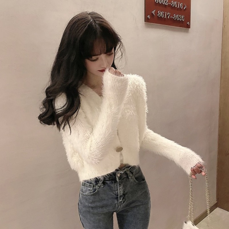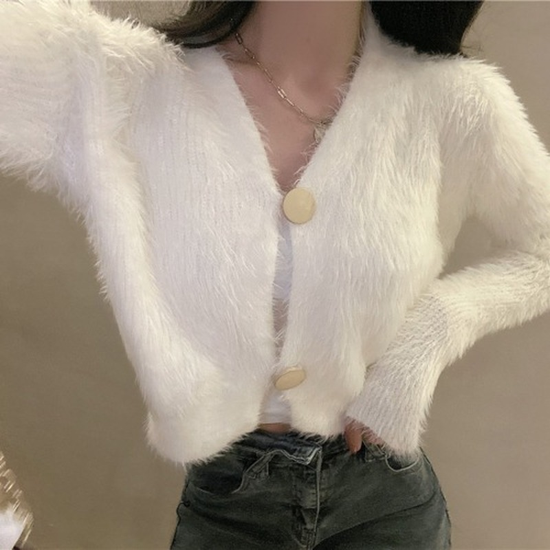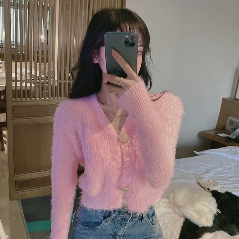 Autumn Winter Pink/White Sweater For Women Long Sleeve Single Breasted Sweet Cardigan Female V-Neck Short Knitted Tops New