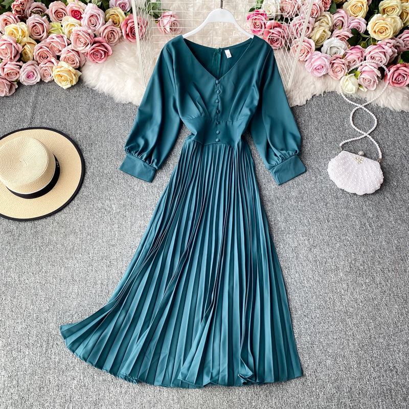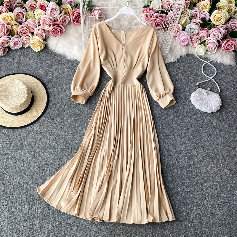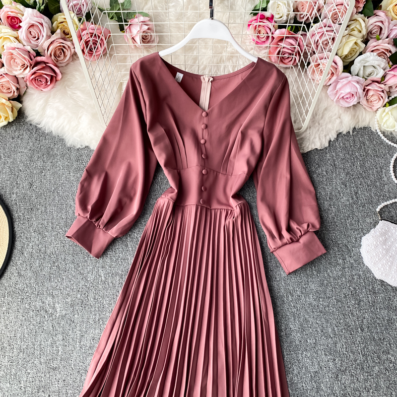 Cheap Dresses, Buy Quality Women’s Clothing Directly from China Suppliers:Autumn Vintage V Neck Pleated Dress For Women Casual Long Sleeve Single Breasted Draped Dresses Female Big Swing Vestidos