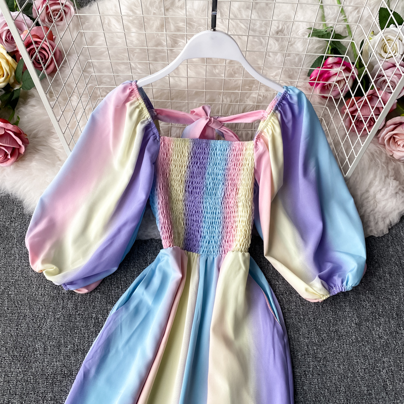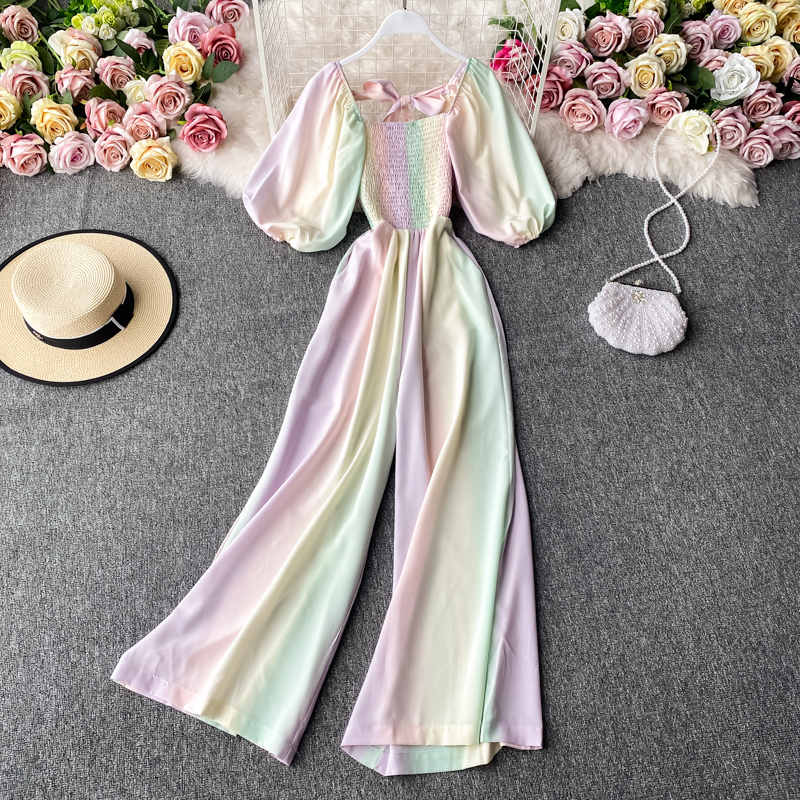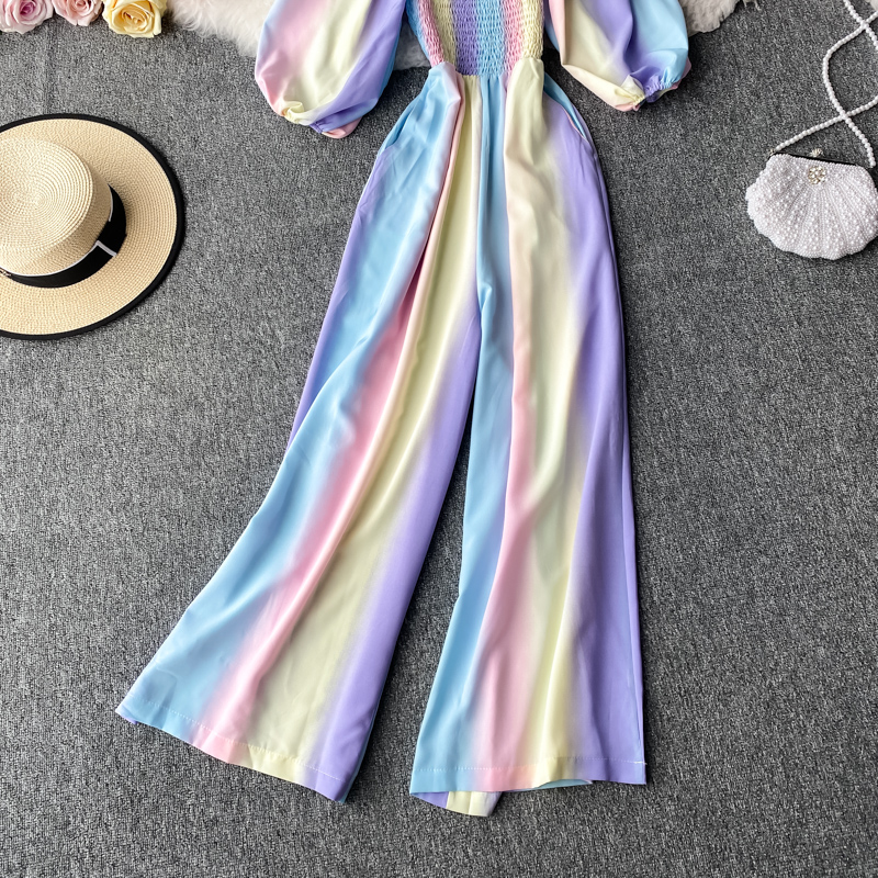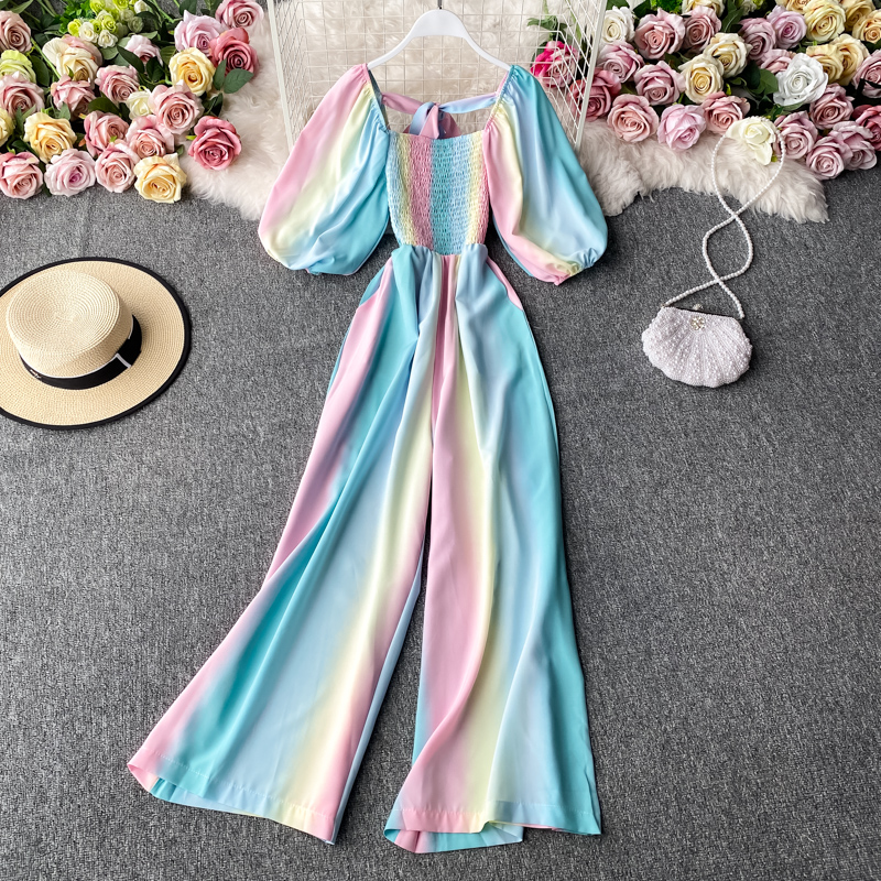 Women’s Rainbow Gradient Jumpsuit Autumn Casual Square Collar Short Sleeve High Waist Romper Female Fashion Playsuit New