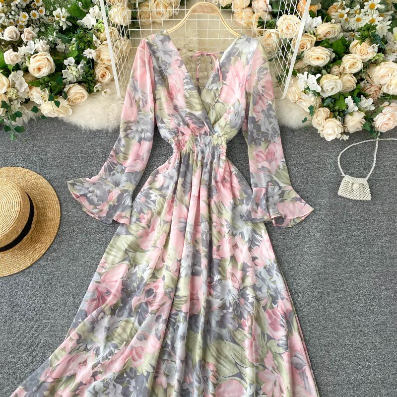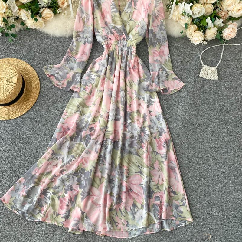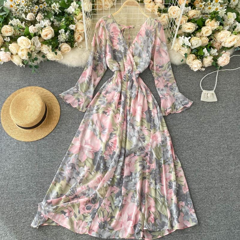 Bohomian Floral Long Dress For Women Sexy V-Neck Flower Printed High Waist Flare Sleeve Vestidos Casual A-Line Autumn Robe
