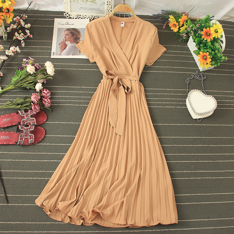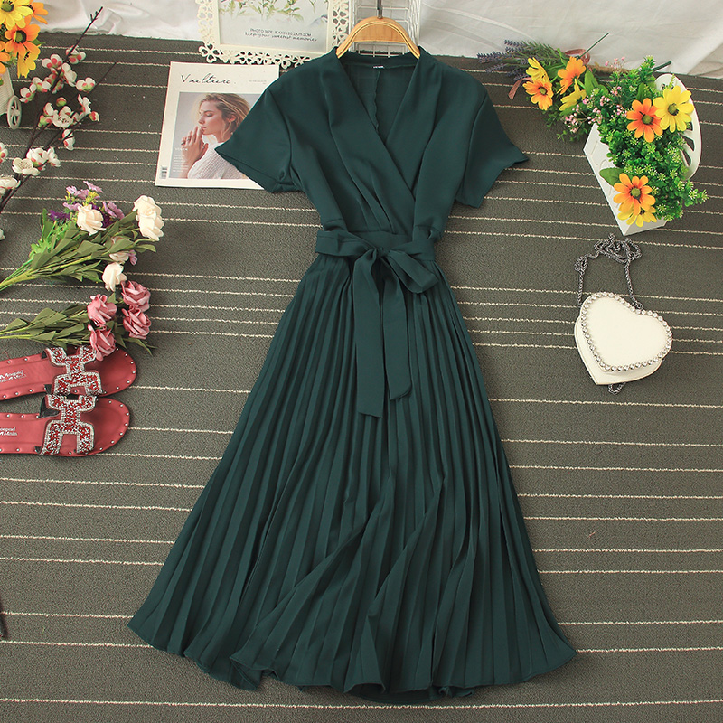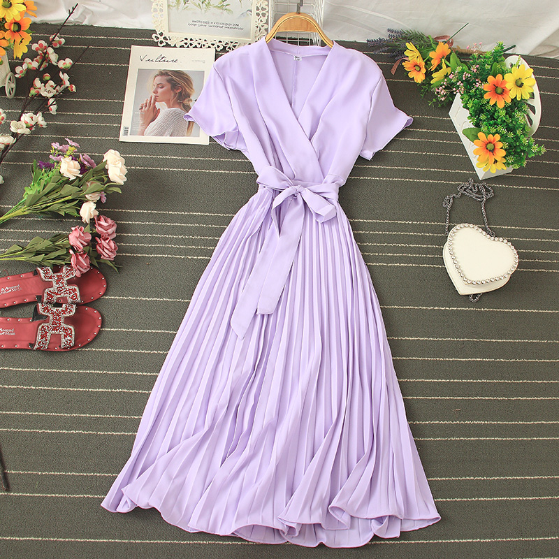 Cheap Dresses, Buy Quality Women’s Clothing Directly from China Suppliers:Summer Women Khaki/Green/Purple Midi Dress Female Sexy V Neck Short Sleeve Sashes Pleated Vestidos A Line Robe New Fashion