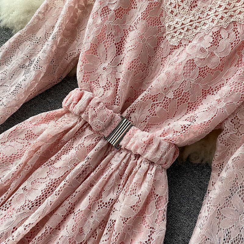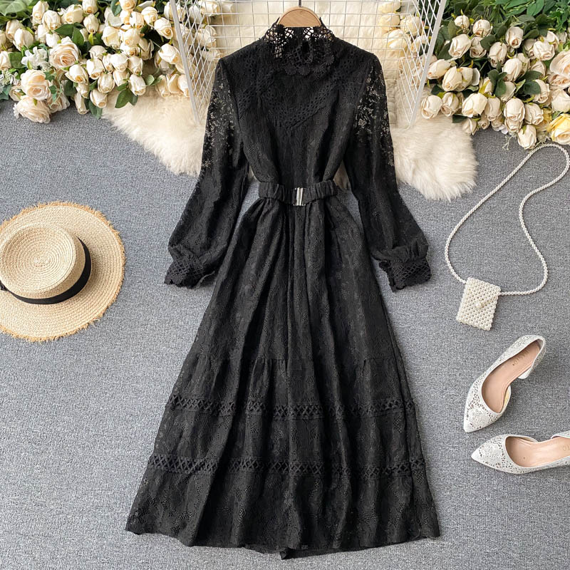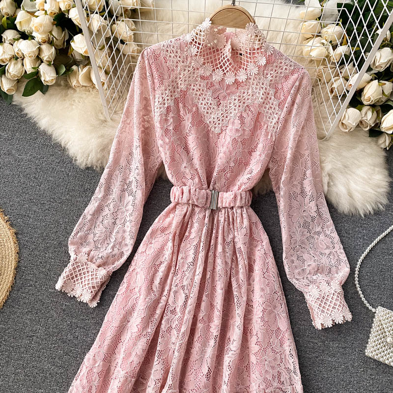 Vintage Lace Hollow Out Women’s Dress Autumn Stand Collar Long Sleeve High Waist Sweet Black/Pink/Beige Robe Fashion New