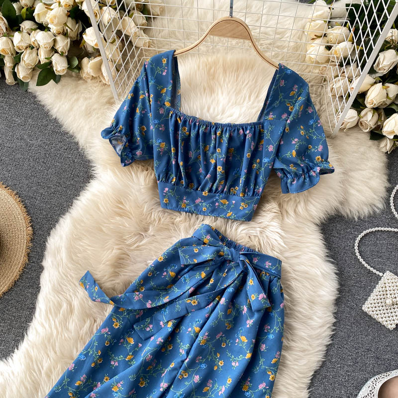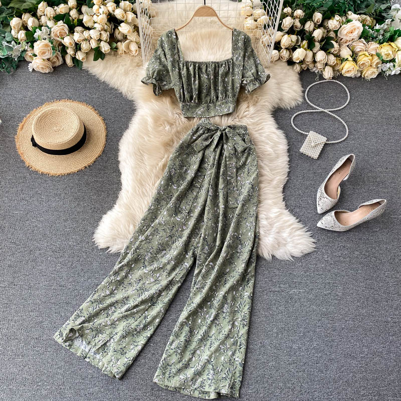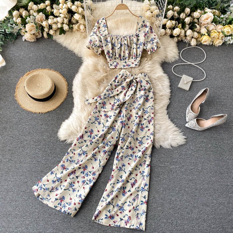 Autumn Bohemian Floral Printed Two Piece Set Sexy Square Collar Short Sleeve Tops + High Waist Wide Leg Pants Fashion Suit