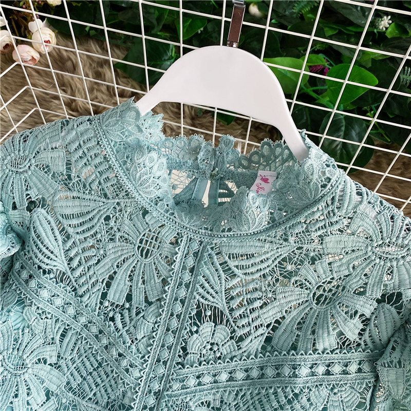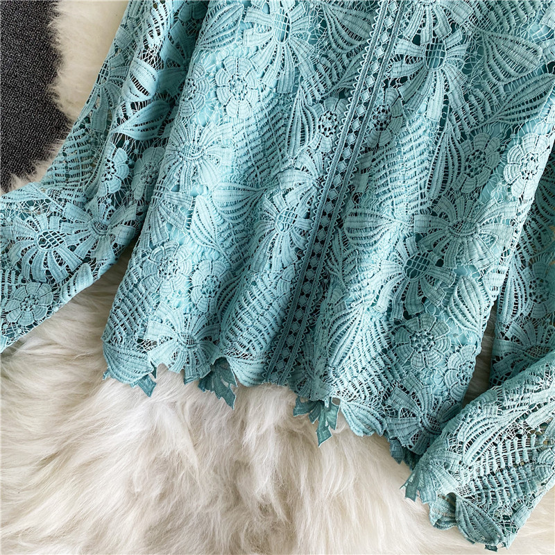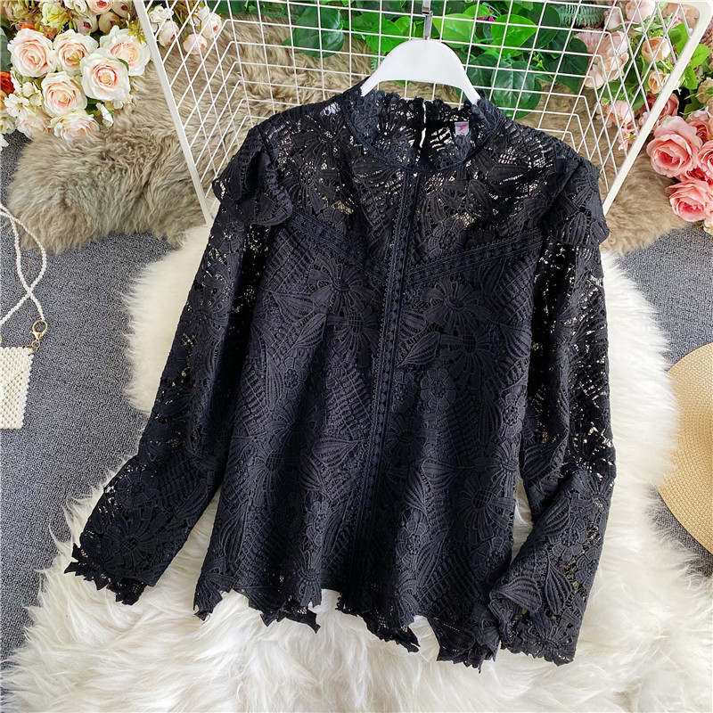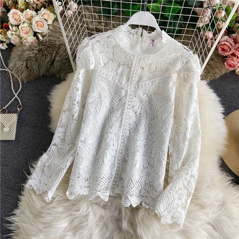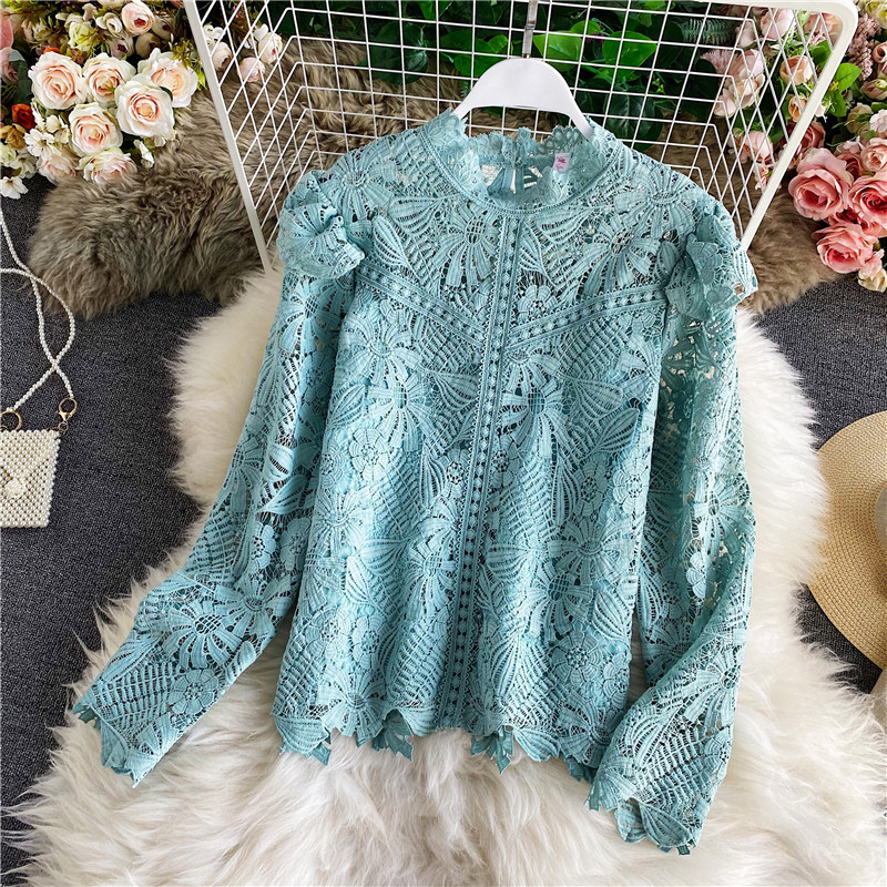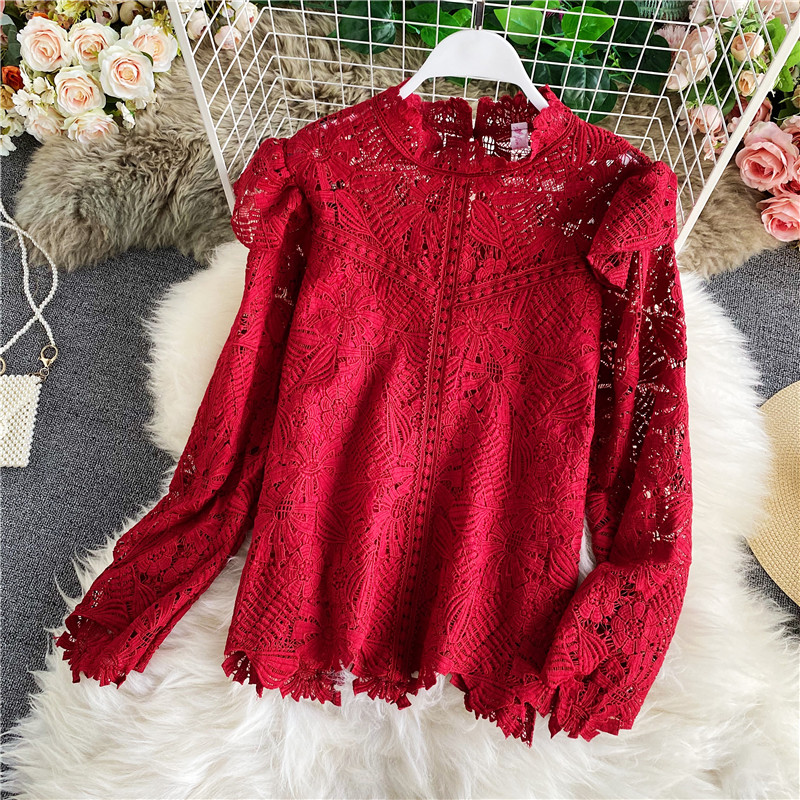 Vintage Lace Patchwork Hollow Out Shirts Women Solid Red/Blue/White Blouse Female Long Sleeve Stand Collar Tops Autumn Fashion