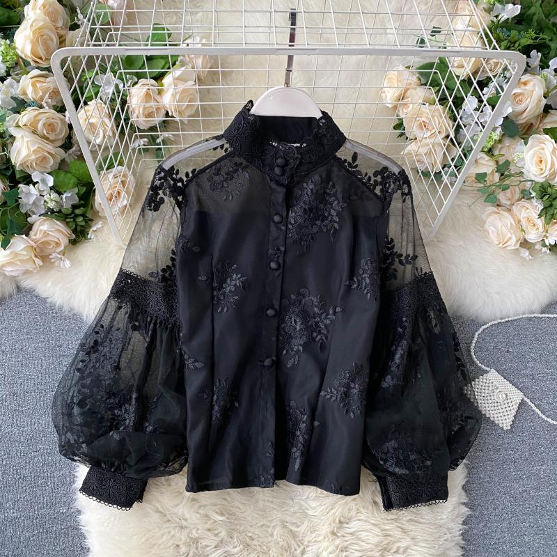 HomeBlouses & Shirts Autumn Vintage Black/White Embroidered Mesh Blouse Women Sexy See Through Slim Patchwork Shirt Female Lantern Long Sleeve Tops