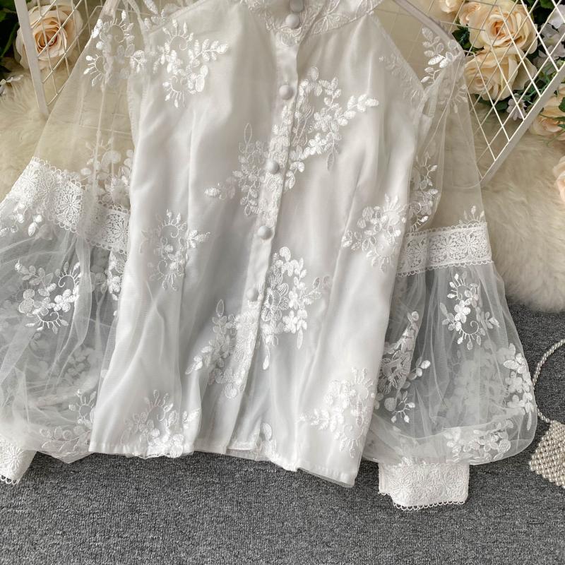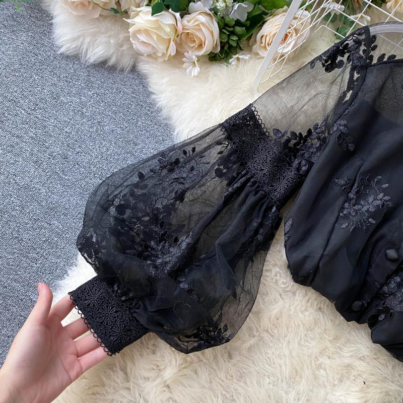 Autumn Vintage Black/White Embroidered Mesh Blouse Women Sexy See Through Slim Patchwork Shirt Female Lantern Long Sleeve Tops