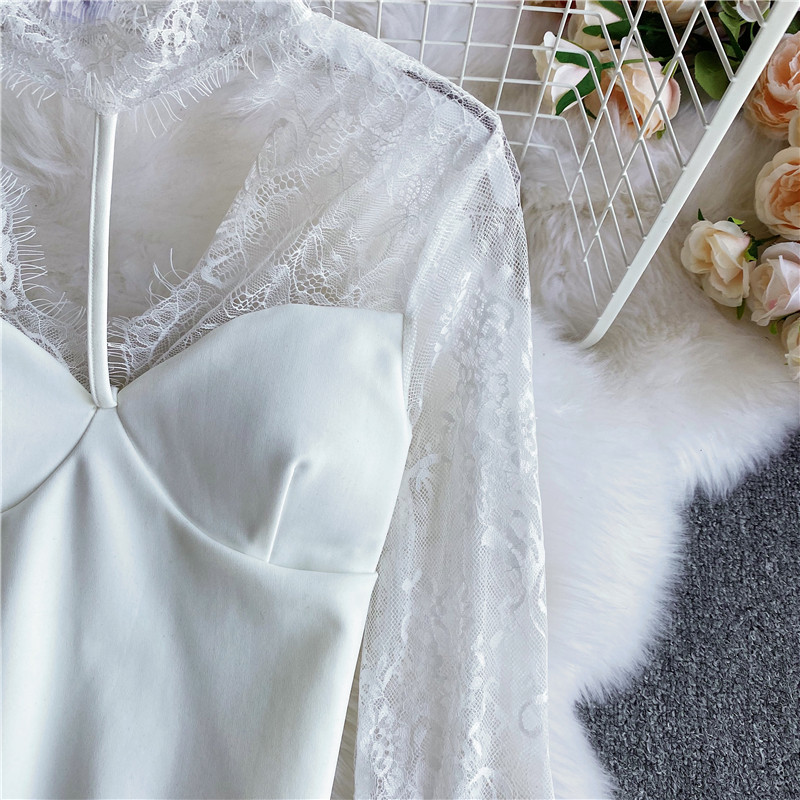 Sexy Halter Lace Patchwork Blouse Women Elegant See-Through Long Sleeve Black Club Party Short Tops Female Bottom Shirt Fashion