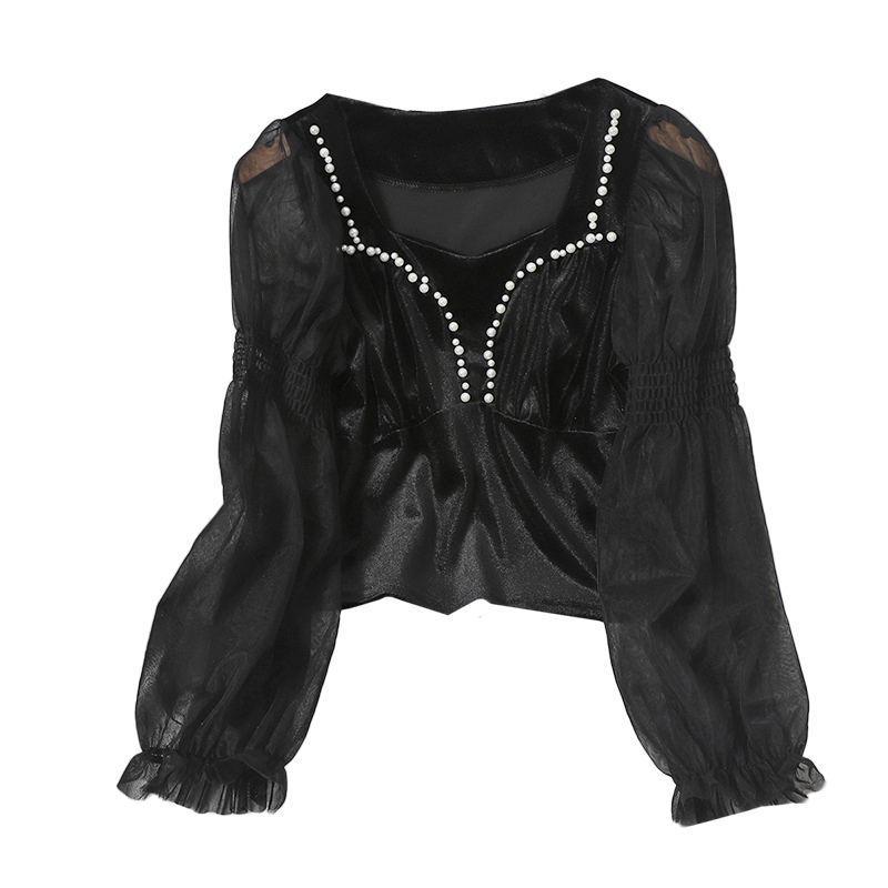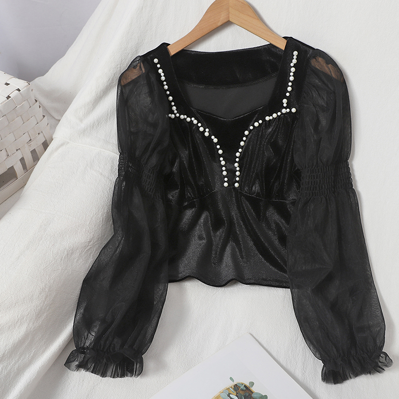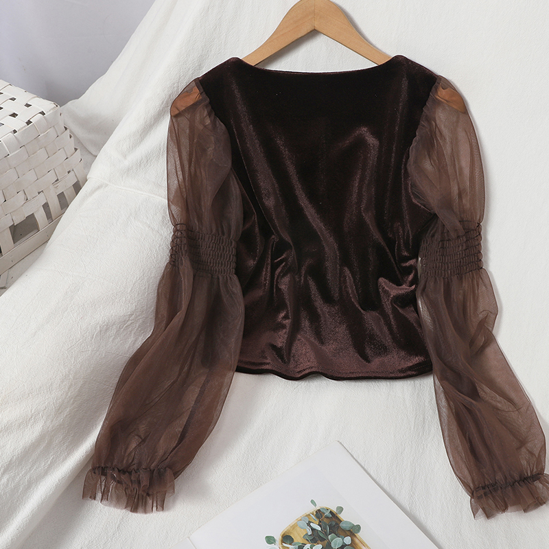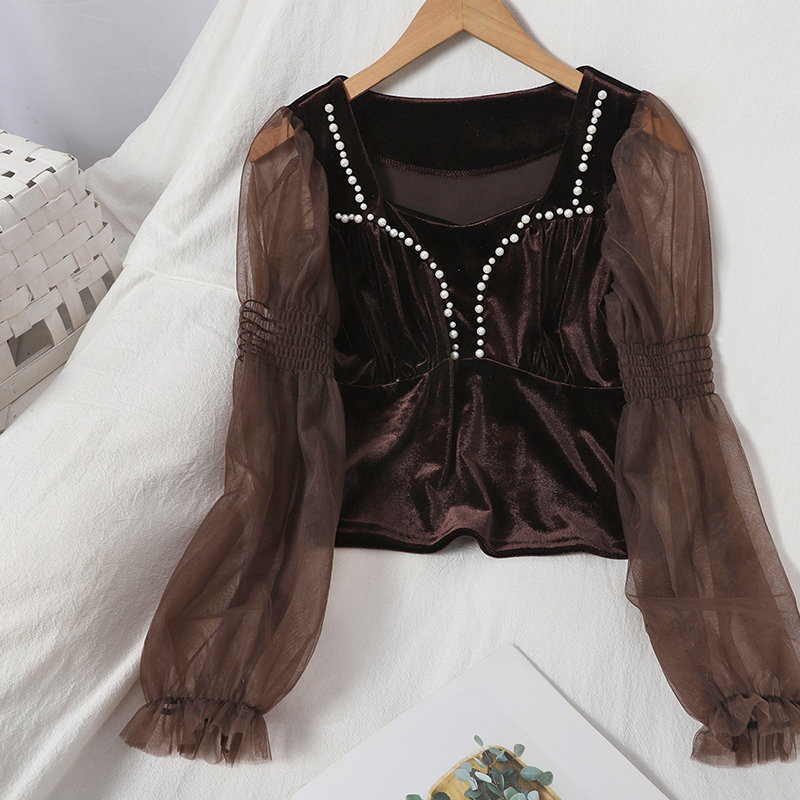 Cheap Blouses & Shirts, Buy Quality Women’s Clothing Directly from China Suppliers:Autumn Brown/Black Mesh Velvet Patchwork Blouse Women Elegant Square Collar Long Sleeve Beading Shirts Female Fashion Tops