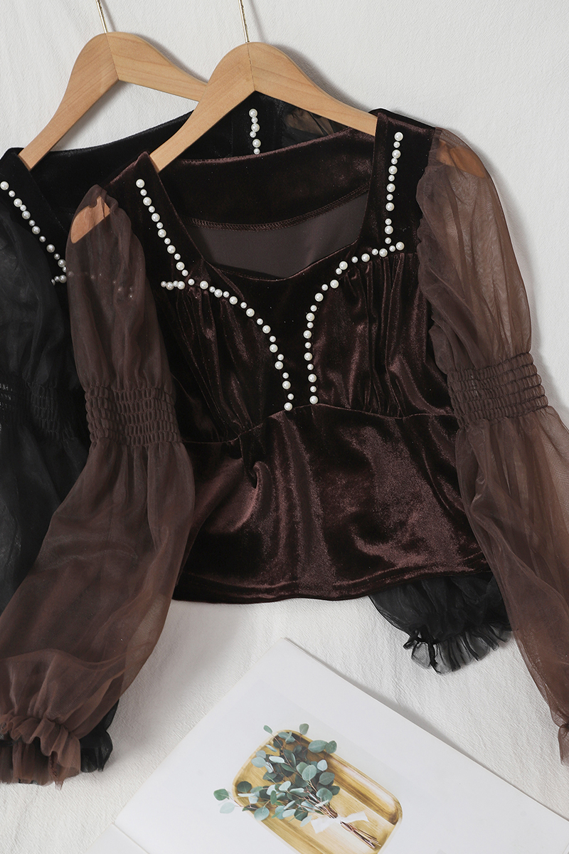 Autumn Brown/Black Mesh Velvet Patchwork Blouse Women Elegant Square Collar Long Sleeve Beading Shirts Female Fashion Tops