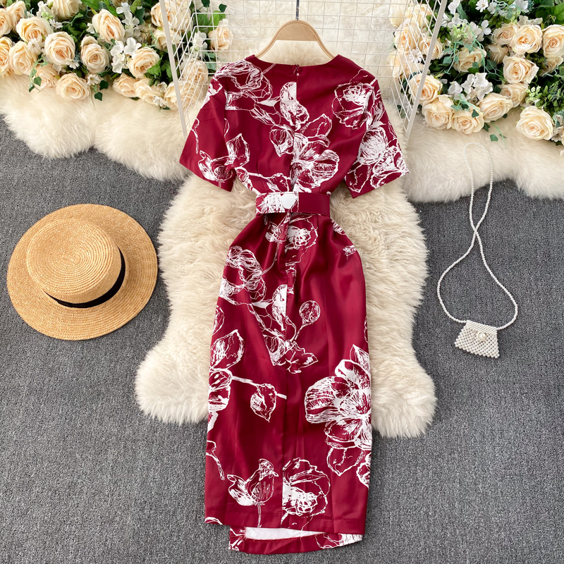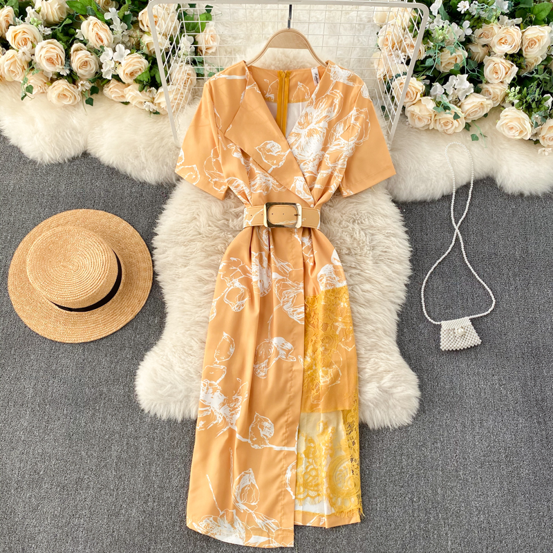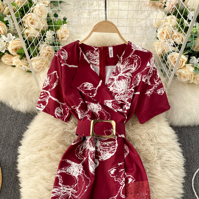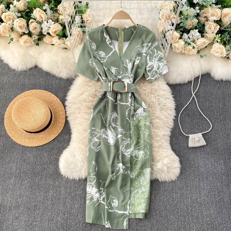 Casual Women Lace Patchwork Printed Bodycon Dress Ladies Office Elegant V-Neck Short Sleeve High Waist Vestidos With Sashes