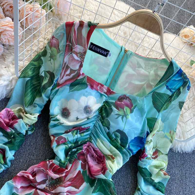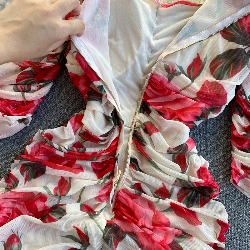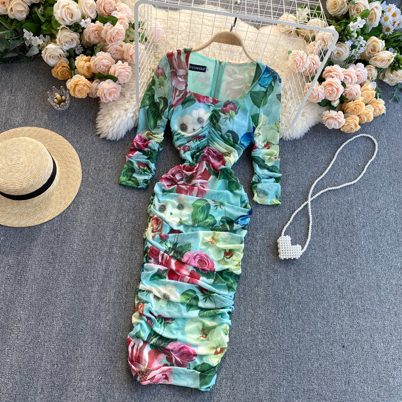 Bohemian Women Flower Printed Pleated Bodycon Dress Female Elegant High Waist Draped Vestidos Spring Autumn Lady Robe Fashion