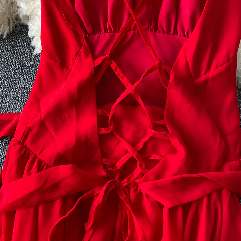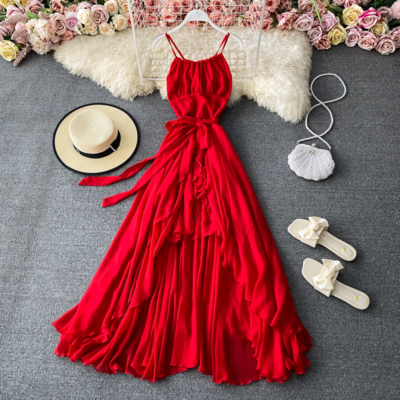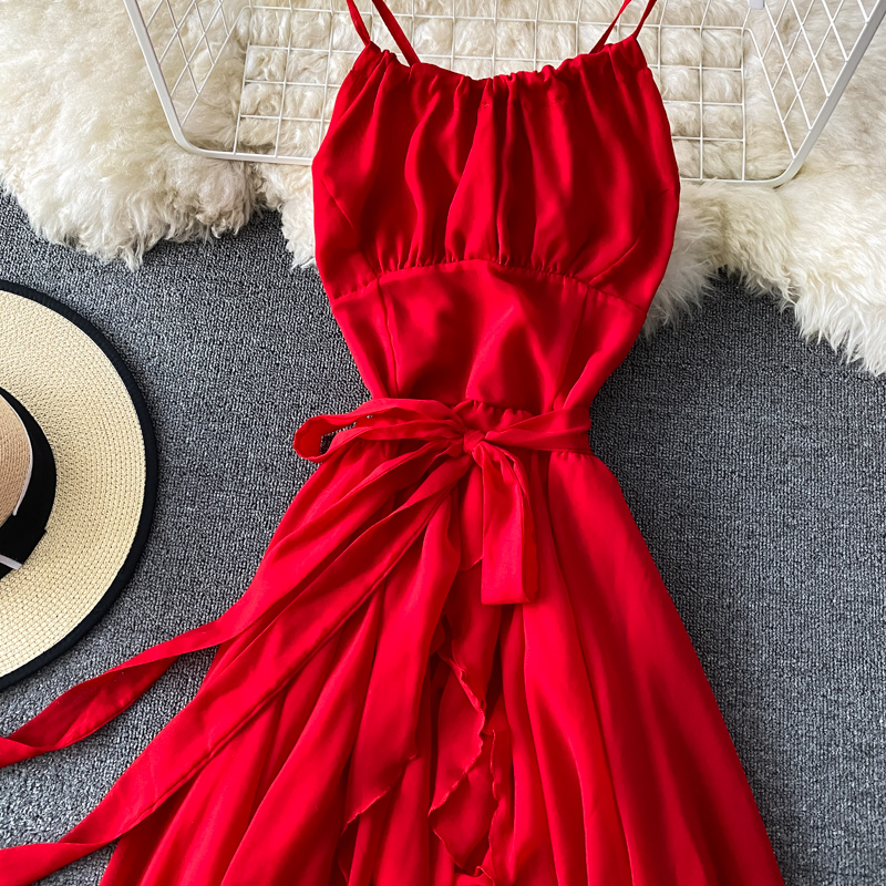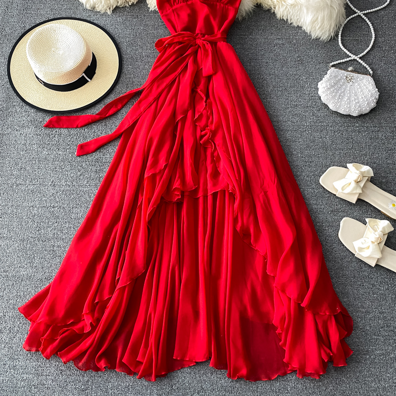 Red Sexy Party Spaghetti Strap Irregular Long Dress Women Elegant Sashes Big Swing Strapless Vestidos Spring Autumn New Fashion