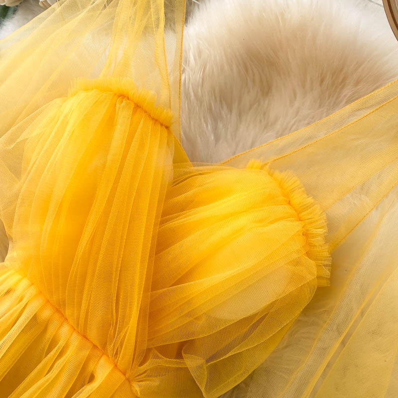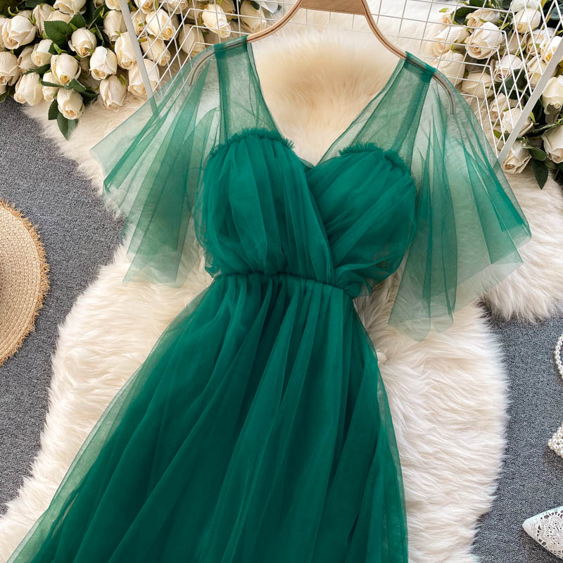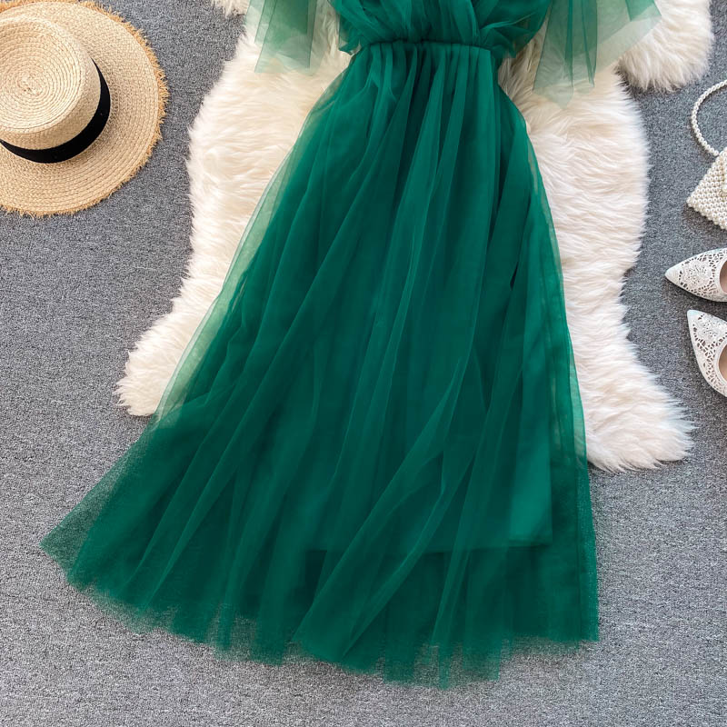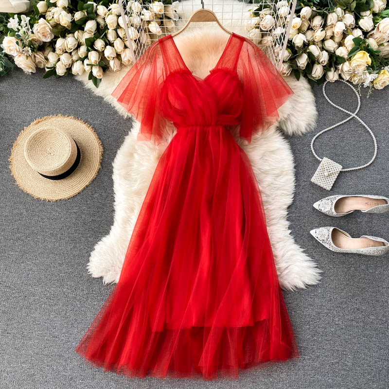 Green/Yellow/Red Sexy Mesh Midi Party Dress Women Casual V-Neck Short Sleeve High Waist Club Fairy Vestidos Female New Fashion