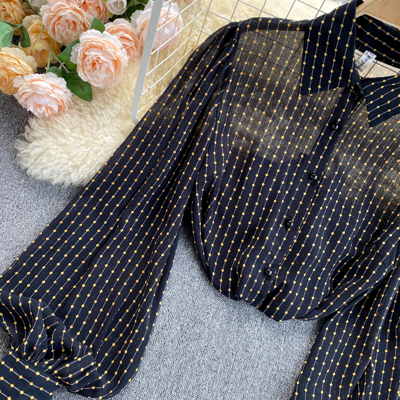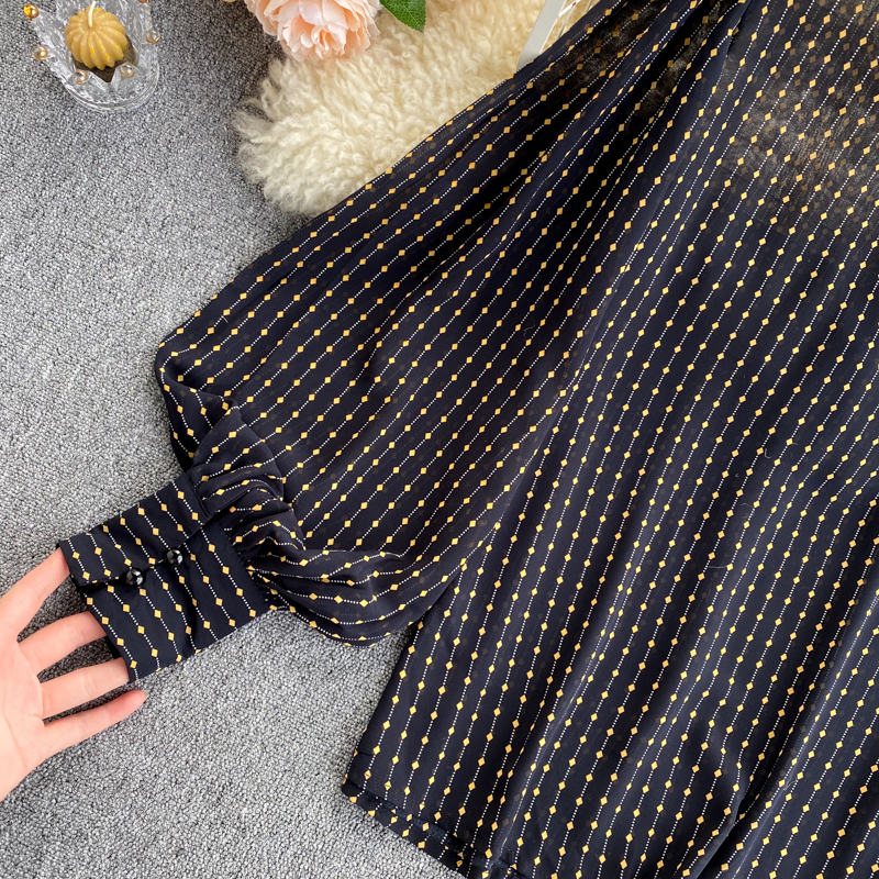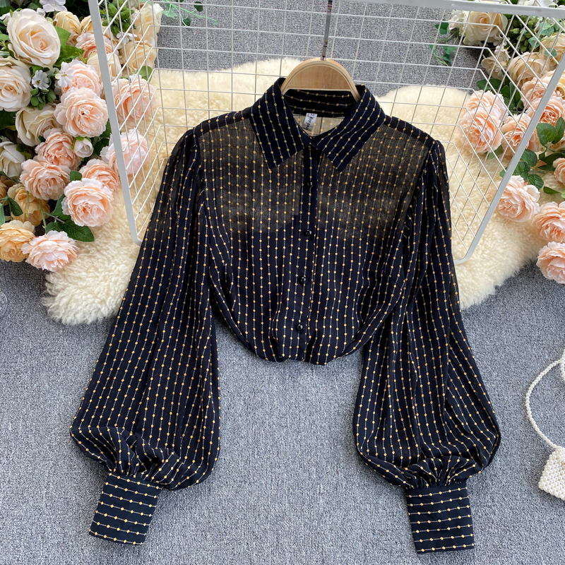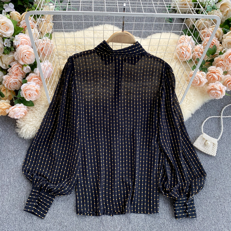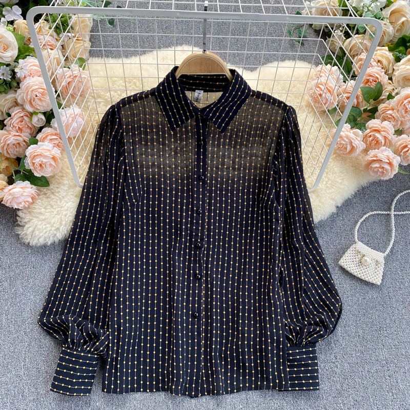 Cheap Shirt, Buy Quality Women’s Clothing Directly from China Suppliers:Women Black Polka Dot Chiffon Blouse Female Vintage Turn Down Neck Lantern Long Sleeve Single Breasted Loose Shirt Spring Autumn