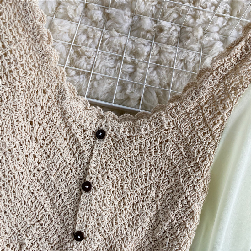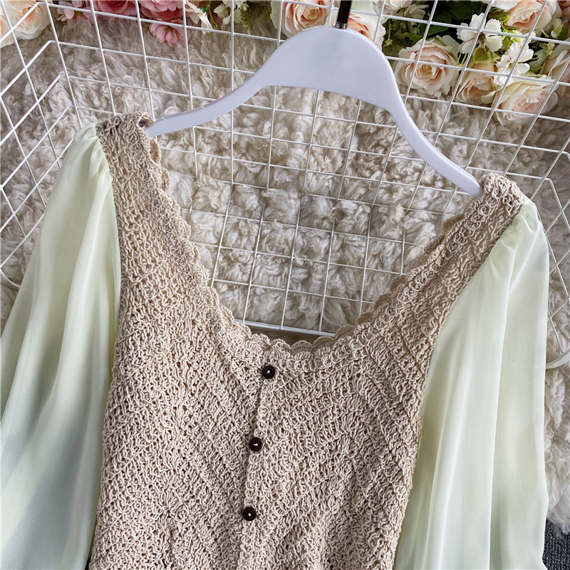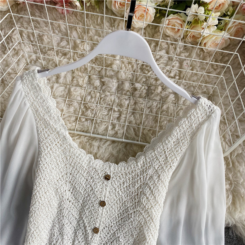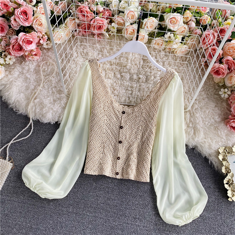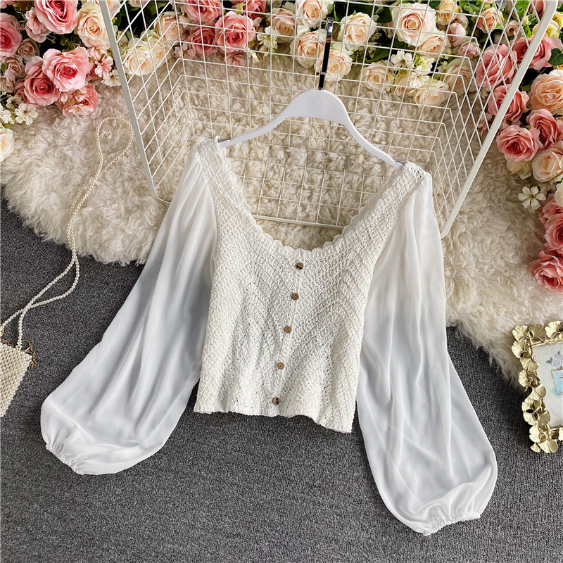 Vintage Hollow Out Blouse Women Elegant V-Neck Single Breasted Puff Long Sleeve Slim Short Tops Female Patchwork Shirt Fashion