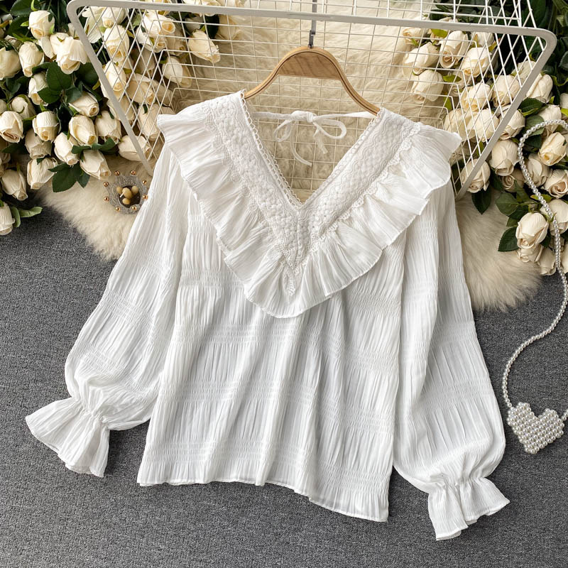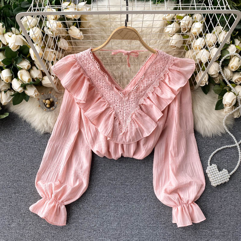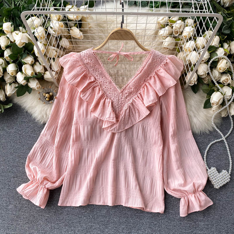 Cheap Blouses & Shirts, Buy Quality Women’s Clothing Directly from China Suppliers:Korean Chic Sweet Pink/Beige/White Blouse Women Elegant V Neck Ruffle Flare Long Sleeve Loose Shirt Female New Spring Autumn