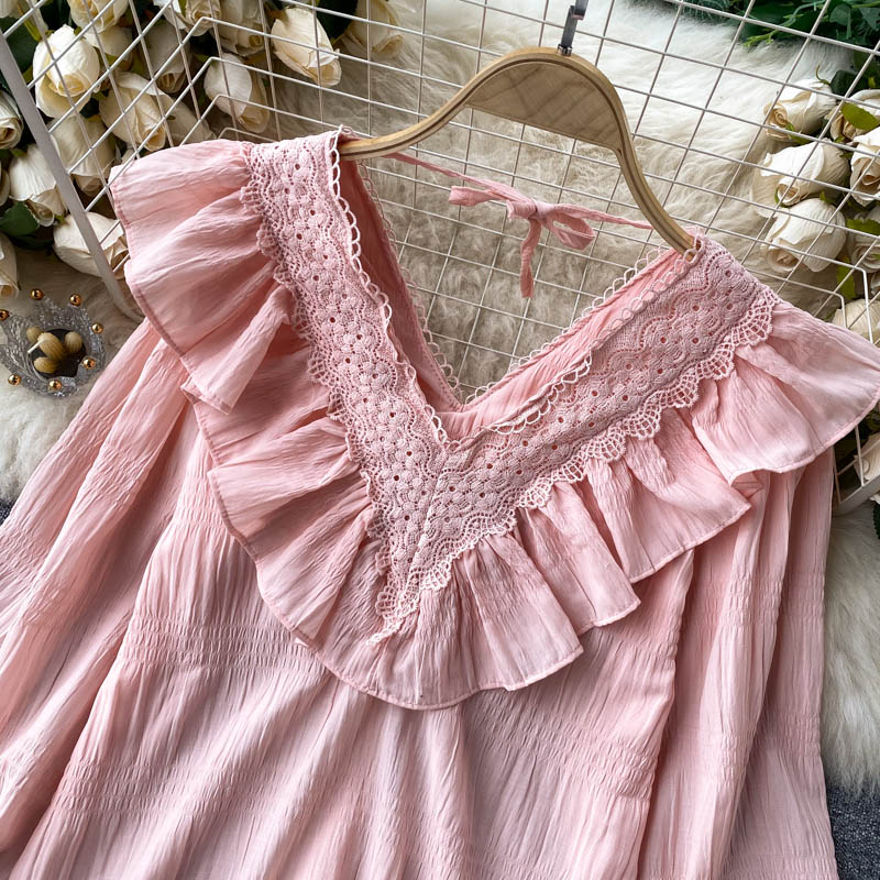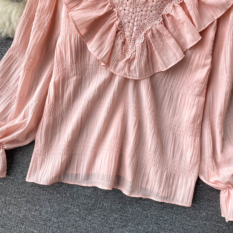 Korean Chic Sweet Pink/Beige/White Blouse Women Elegant V-Neck Ruffle Flare Long Sleeve Loose Shirt Female New Spring Autumn