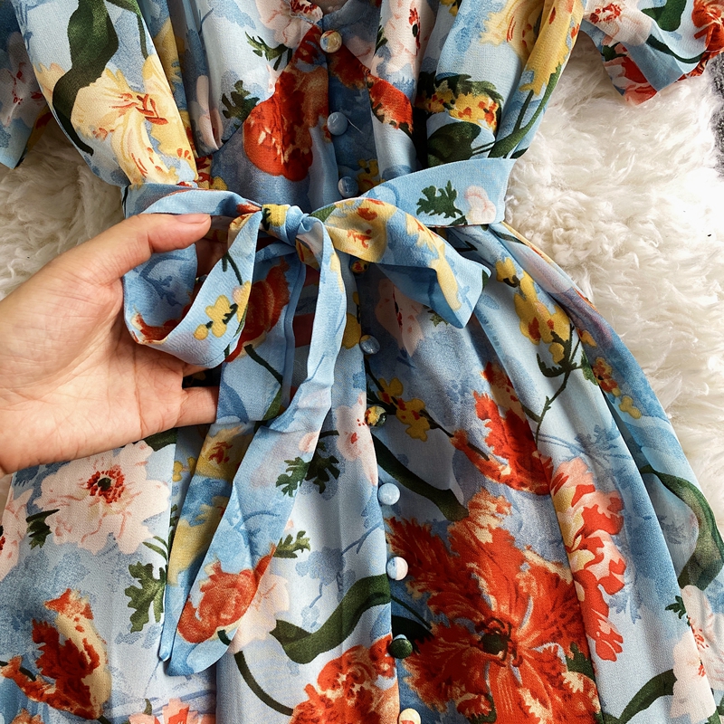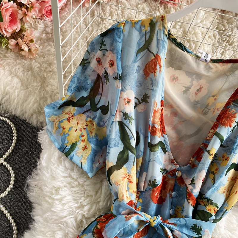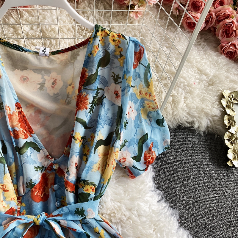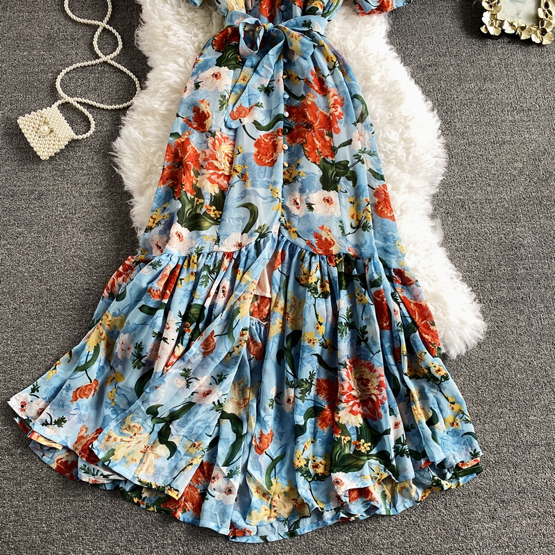Bohemian Vacation Beach Floral Printed Long Dress Women Sexy V-Neck Short Sleeve High Waist Ruffle Hem Vestidos Spring Summer