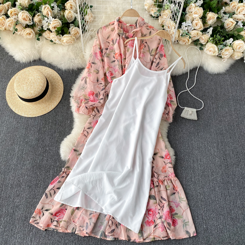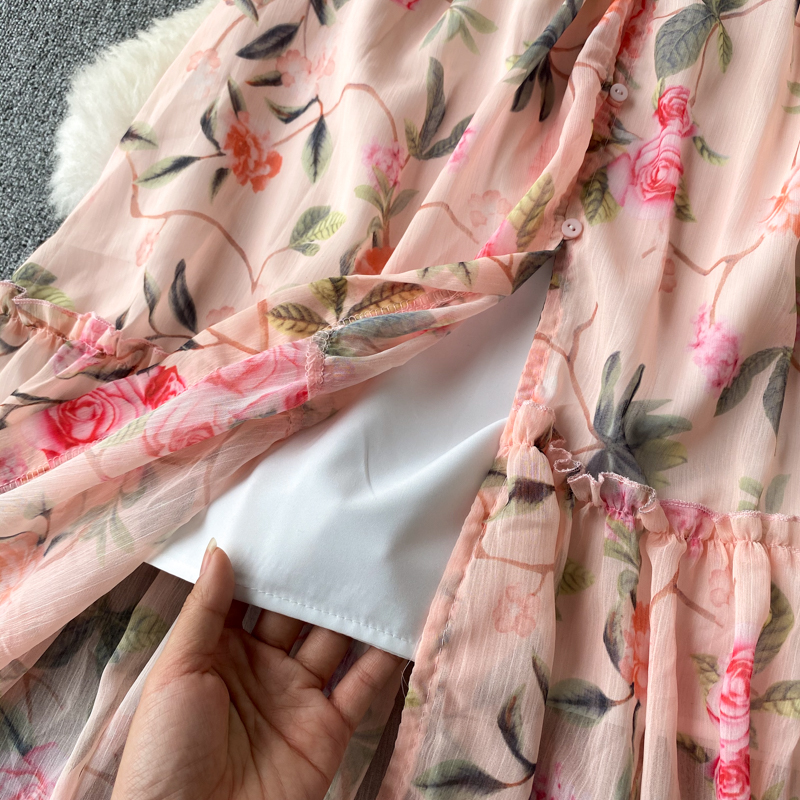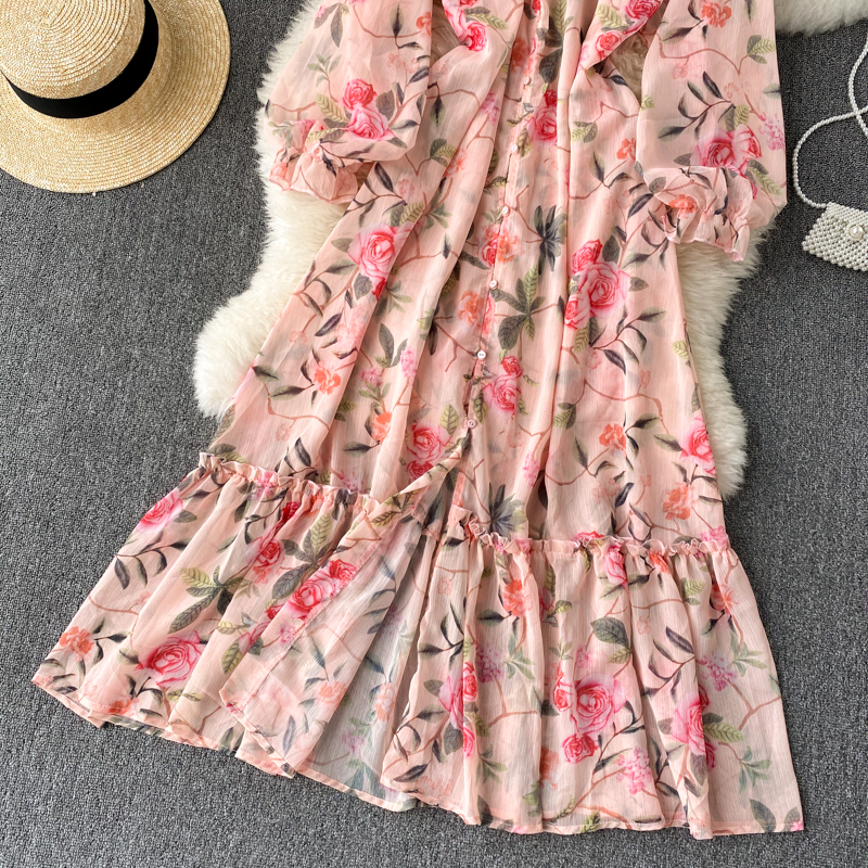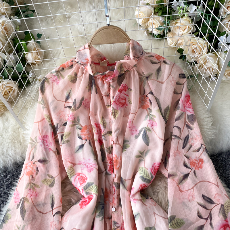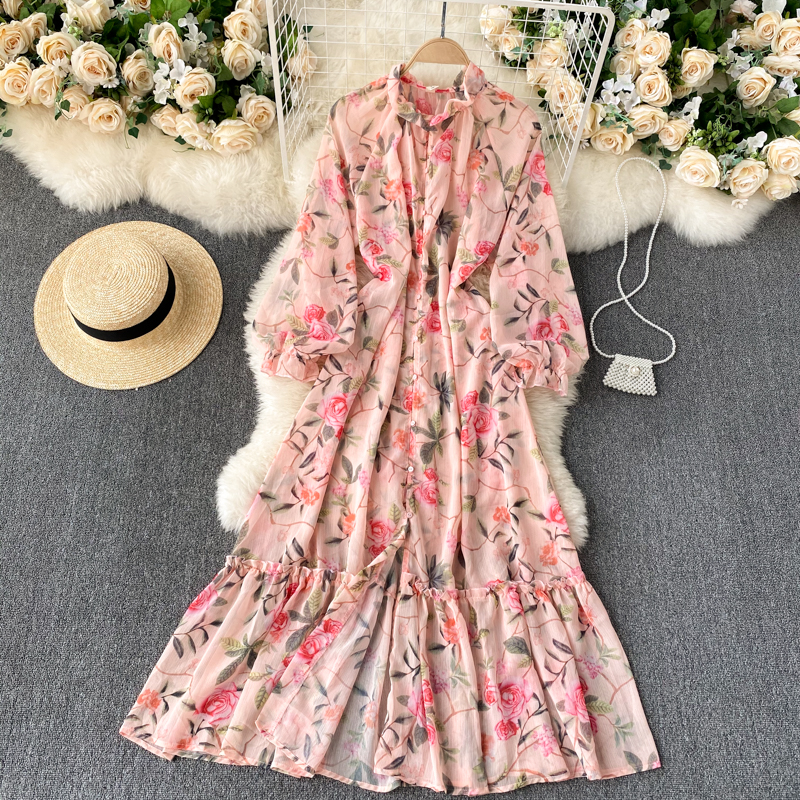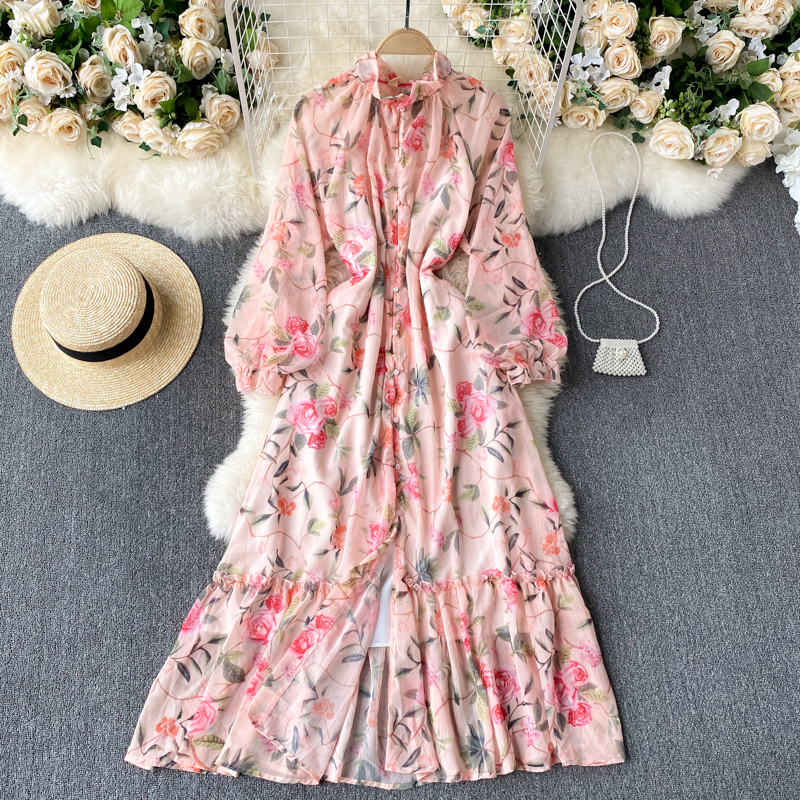 Spring Autumn Bohemian Women Floral Chiffon Long Dress Pink Flower Printed Robe Elegant Stand Collar Single Breasted Beach Boho
