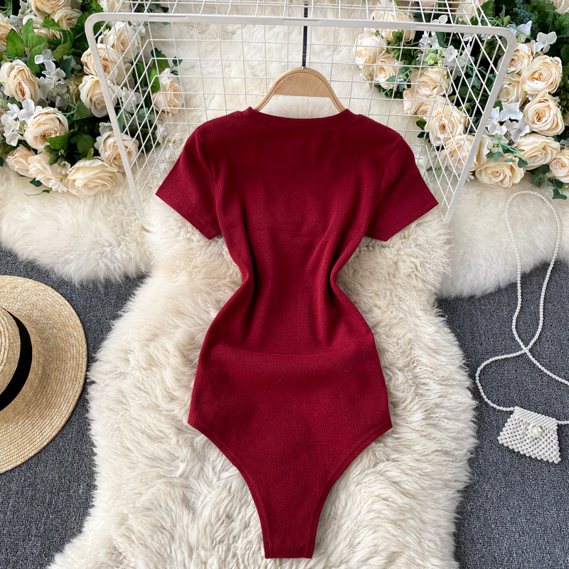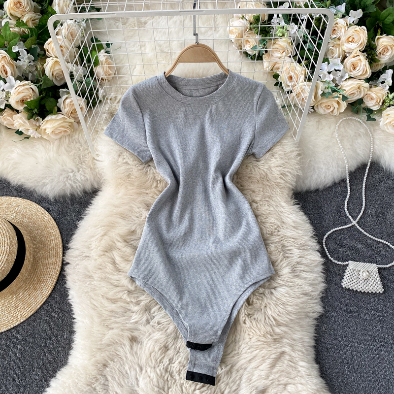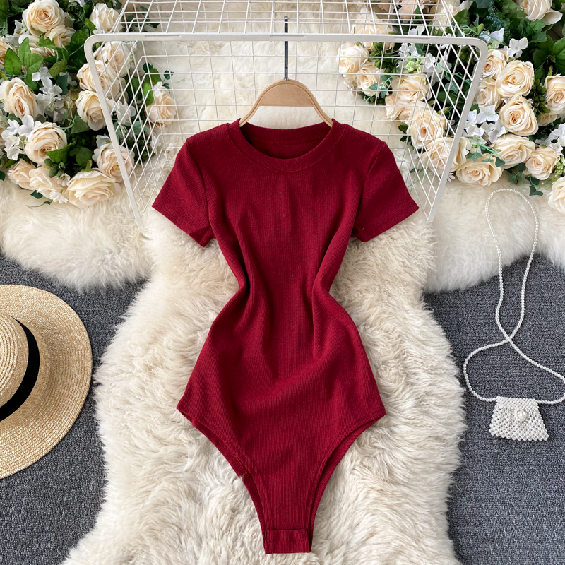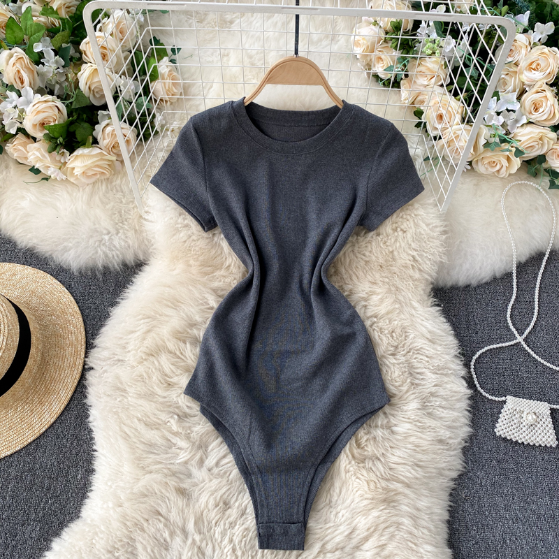 Black/Gray/Red Knit Jumper Women Elegant Round Neck Short Sleeve High Waist Bodycon Playsuit Casual Slim Jumpsuit Spring Summer