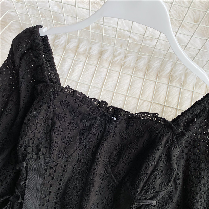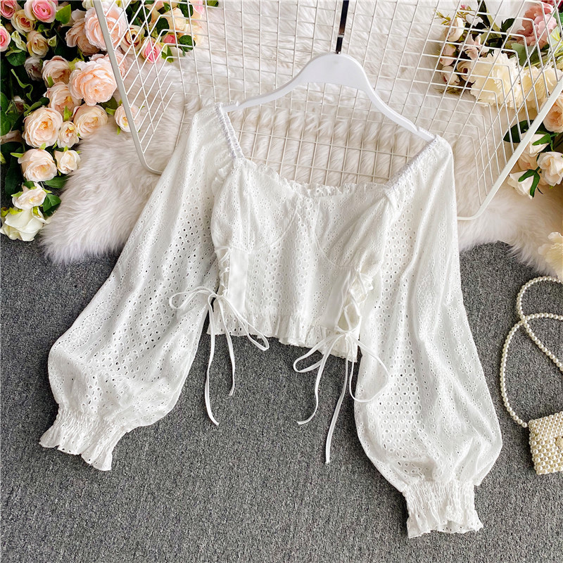 Cheap Blouse, Buy Quality Women’s Clothing Directly from China Suppliers:Casual Square Collar Black/White Hollow Out Short Tops Women Elegant Lantern Long Sleeve Drawstring Blouse Female Spring Summer