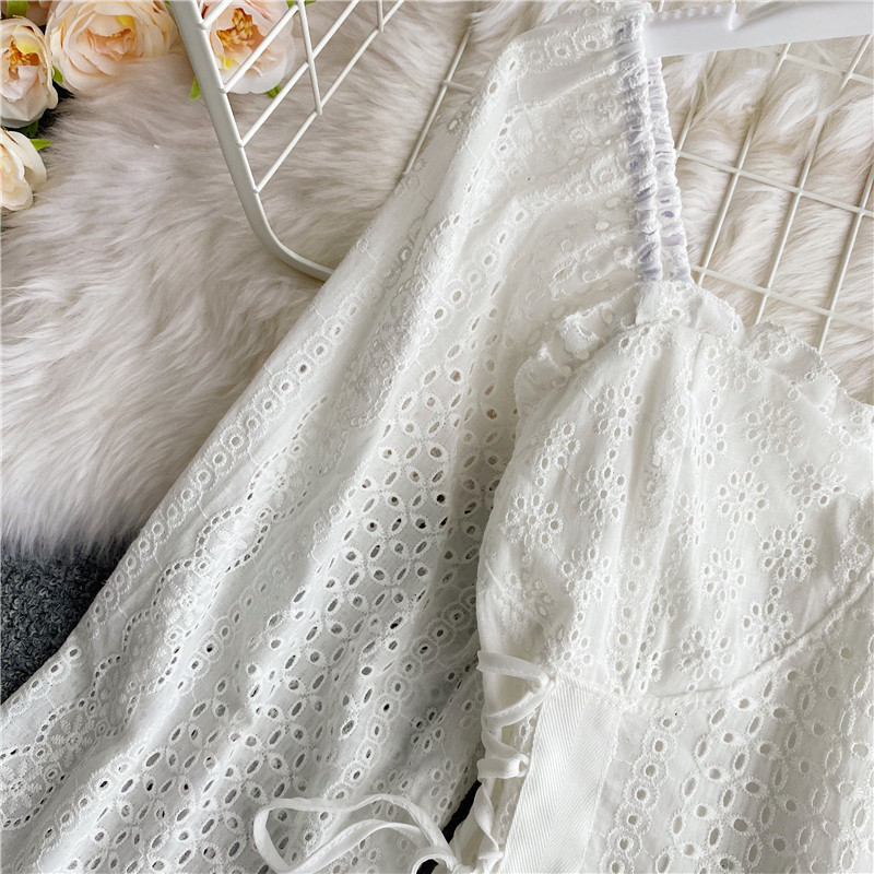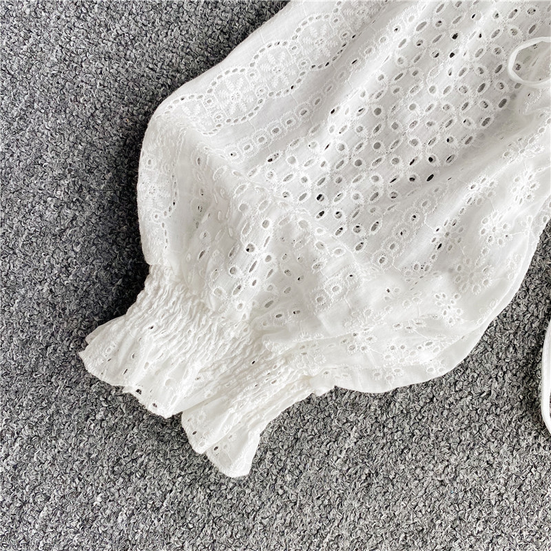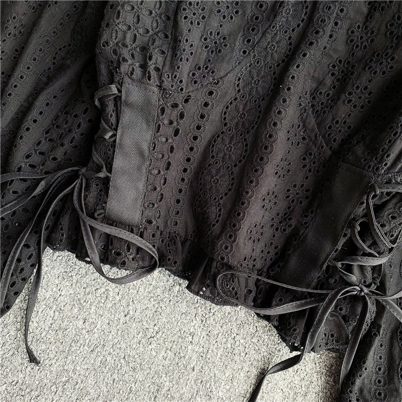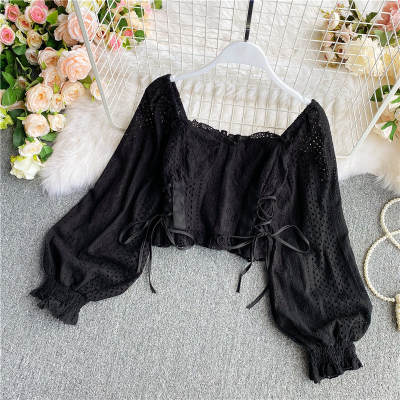Casual Square Collar Black/White Hollow Out Short Tops Women Elegant Lantern Long Sleeve Drawstring Blouse Female Spring Summer